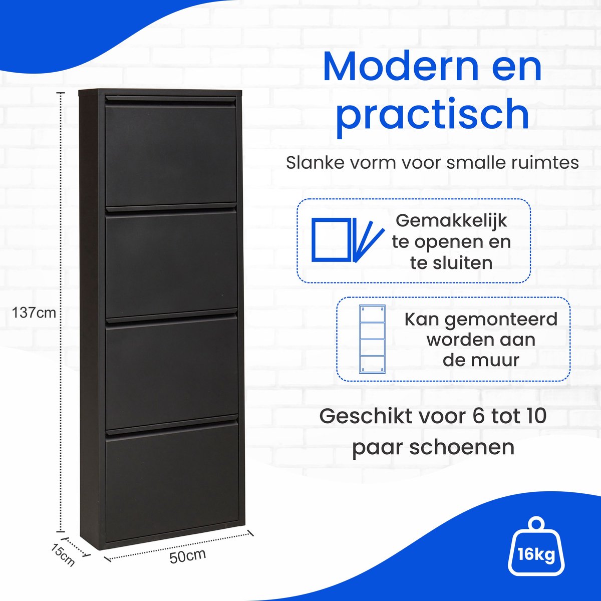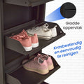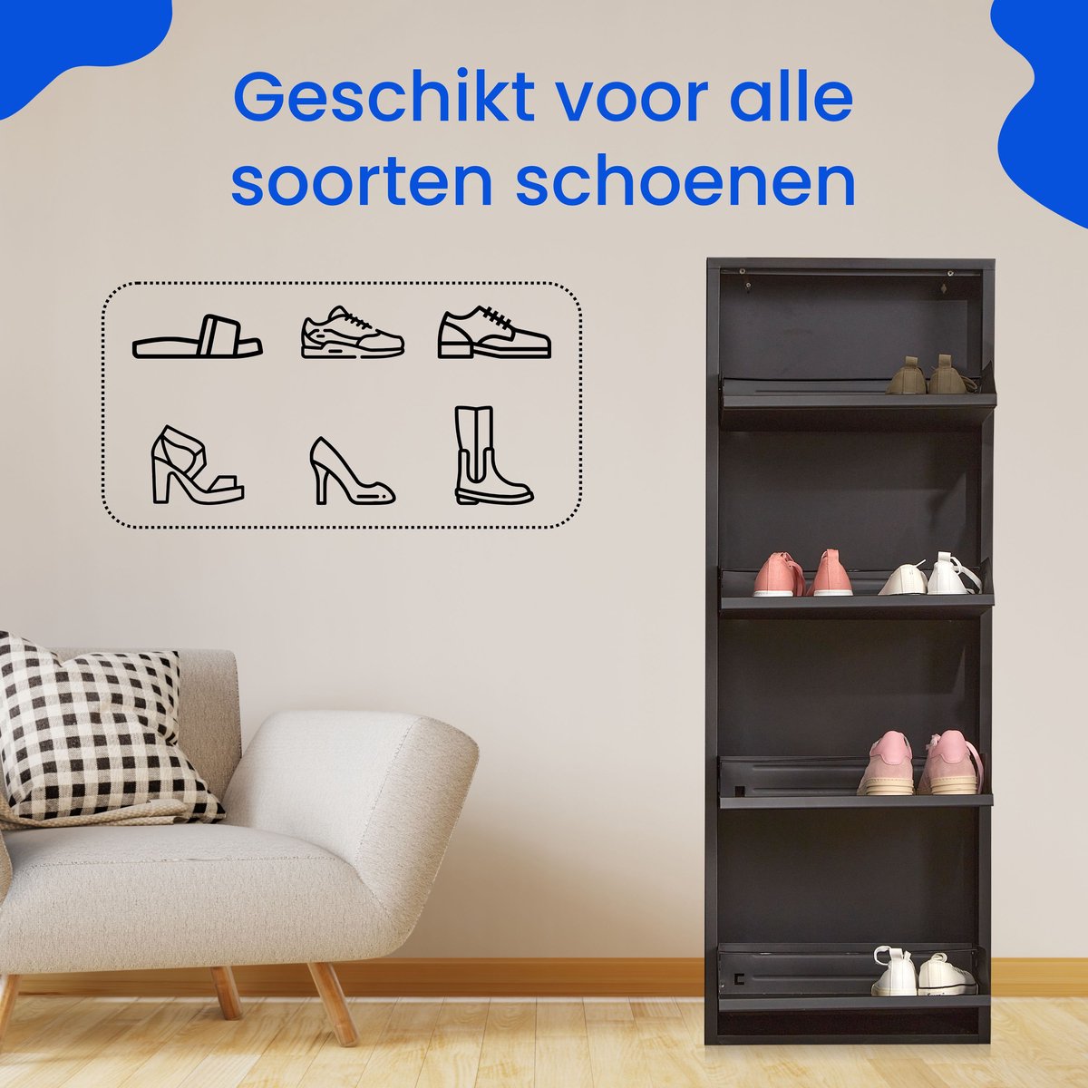 De schoenenkast biedt met zijn vier kantelvakken ruimte voor maximaal acht paar schoenen.