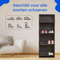 Een schoenenkast, een schoenenrek, een hangend schoenenrek of toch een schoenenbankje? Schoenenkasten zijn er in verschillende soorten. Wil je liever dat je schoenen uit het zicht zijn? Nemen een schoenenkast met kleppen of deuren, of juist een schoenenhangzak of -rek voor achter de deur. Wil je er liever gewoon veel kwijt, kies dan een groot staand rek. Of wil je een leuke opbergplek waar je ook gelijk op kan zitten? Ga voor een schoenenbankje.