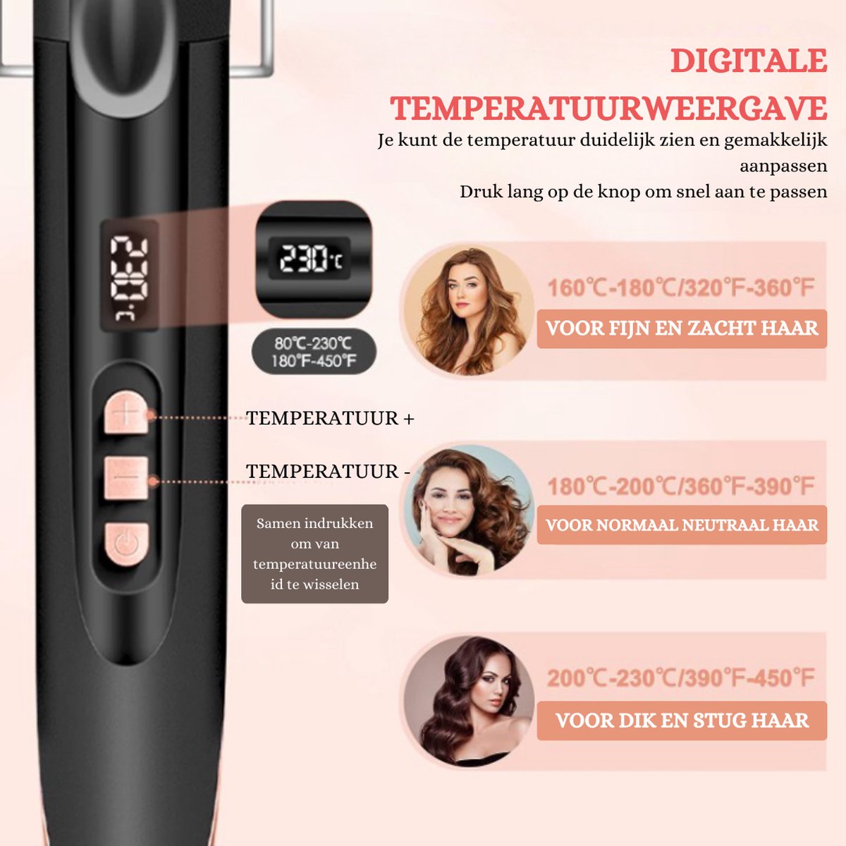 Digitale Temperatuurregeling: Met het duidelijke digitale temperatuurdisplay kun je de gewenste temperatuur eenvoudig aanpassen. Het brede temperatuurbereik van 80-230°C maakt het geschikt voor verschillende haartypes en stelt je in staat om prachtige kapsels te creëren voor diverse gelegenheden.
