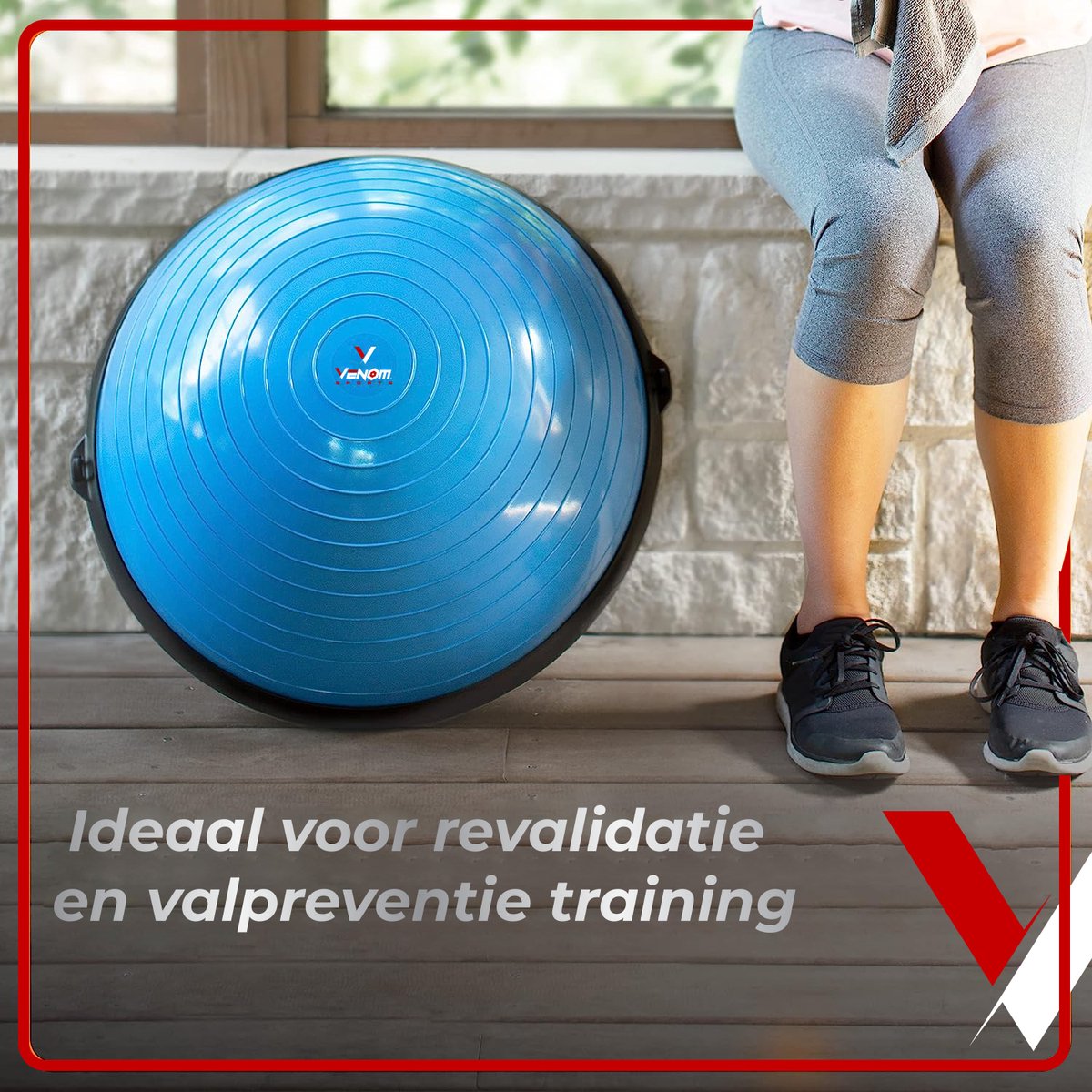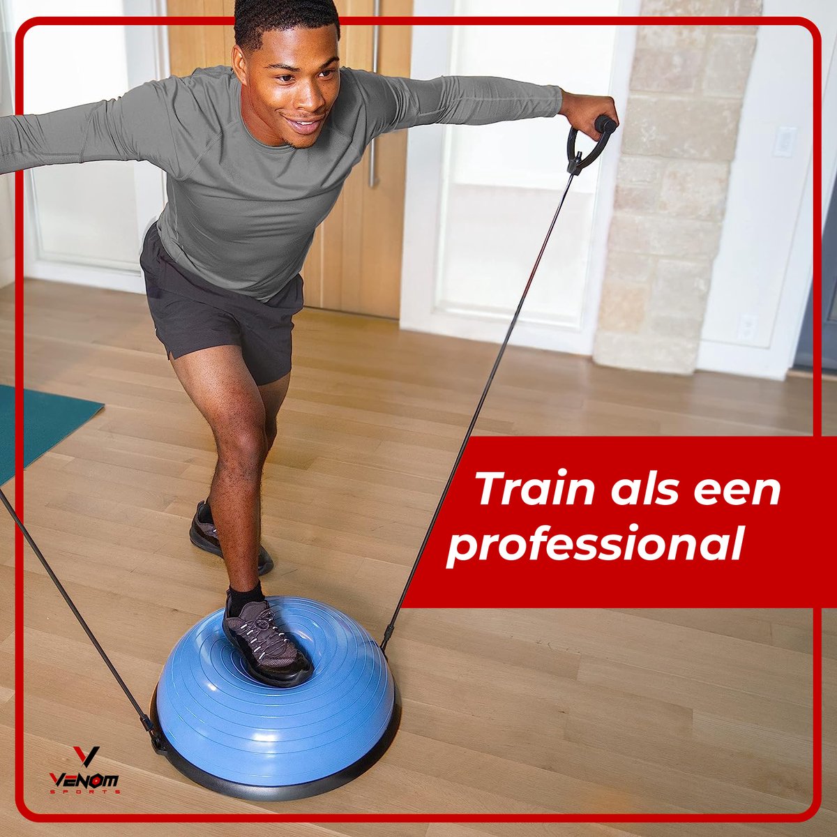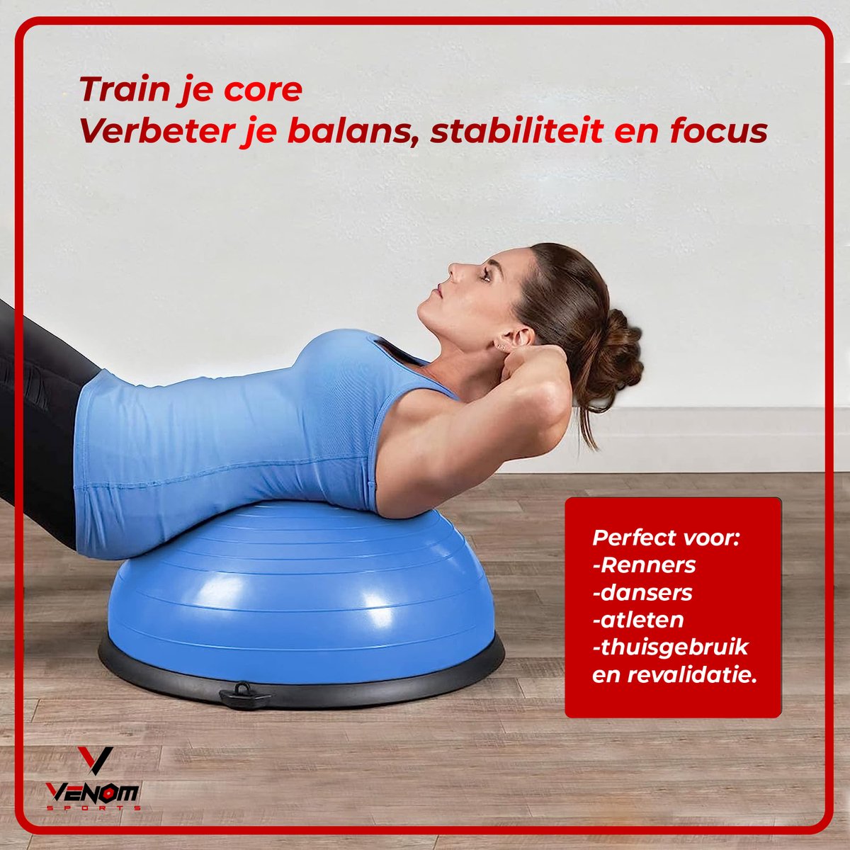 Voel je fit en energiek met de Venom Sports® X-BALL! Deze unieke balanstrainer legt de klemtoon op stabiliteit en een verbeterde balans. Of je nu thuis traint of op locatie, deze halve yoga-bal is perfect om te rekken en strekken, evenals voor pilates, stabiliteitstraining en full body workouts. Oefen je lichaam zowel letterlijk als figuurlijk met deze stevige bal die stand houdt bij elke beweging.
