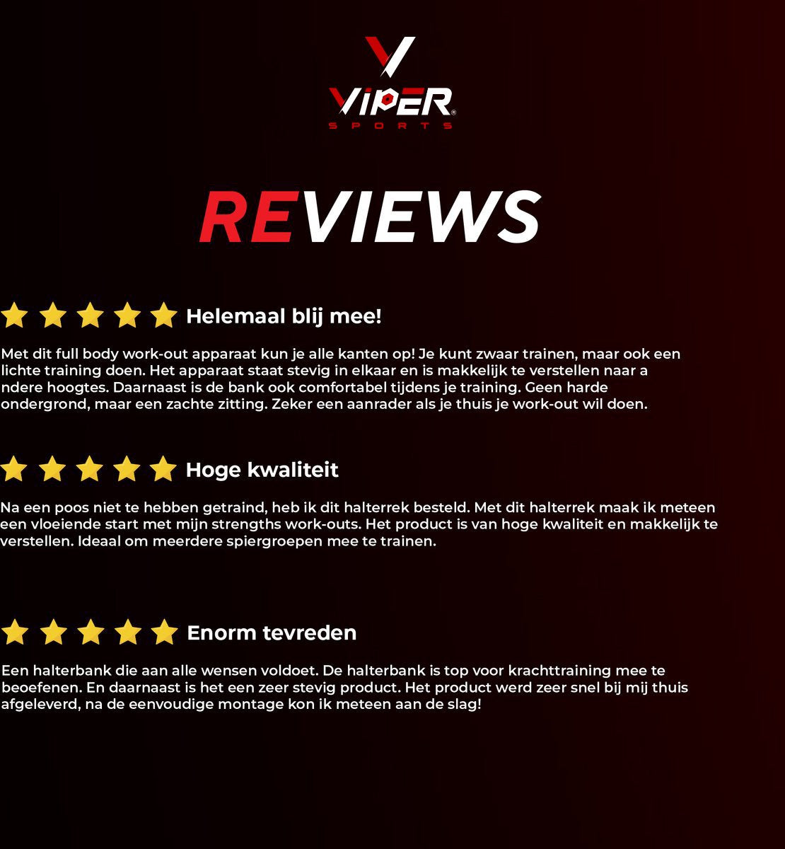 Viper Sports is gemaakt voor én door de Nederlandse fitness liefhebber. De producten van Viper Sports zijn zorgvuldig ontworpen voor de (thuis)sporter. Bij het ontwerpen en samenstellen van de producten is nauwlettend gedacht aan grip, vorm en materialen, zodat iedere beginnende en gevorderde sporter gebruik kan maken van de Viper Sports artikelen. De gym producten zijn uitsluitend gemaakt van sterke materialen, zodat jij elke dag opnieuw kan werken aan jouw sportieve doelstellingen. Viper Sports is een ervaren e-commmerce leverancier in sportartikelen, zo kunt u altijd contact opnemen met de klantenservice en rekenen op de snelst mogelijke levering.