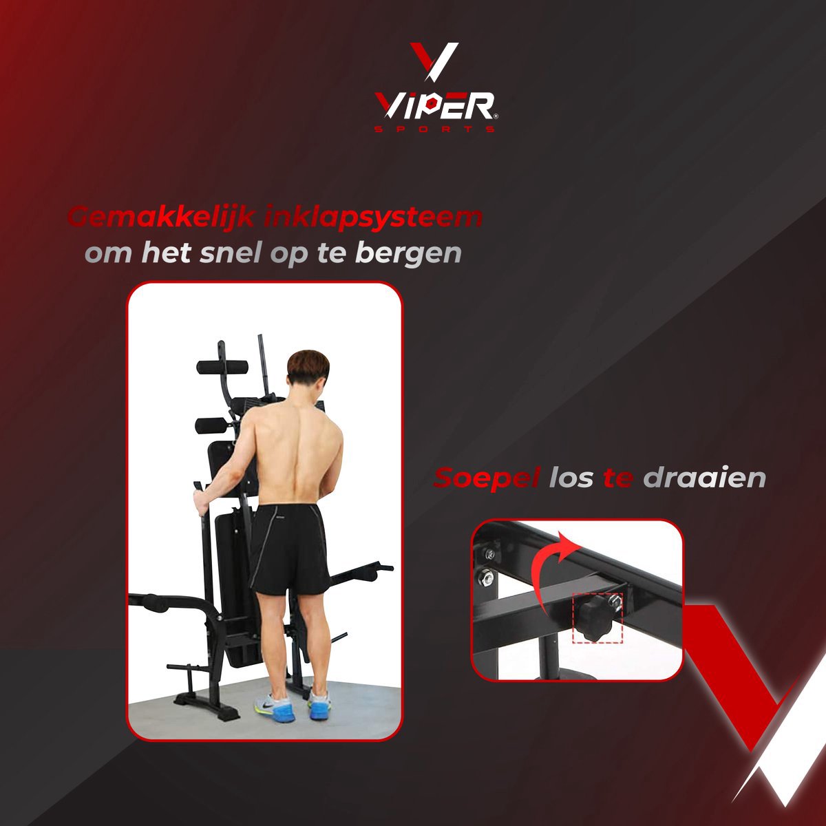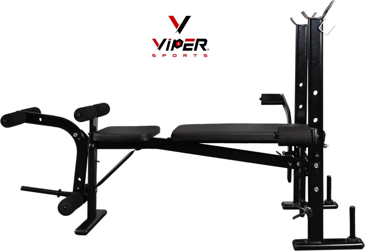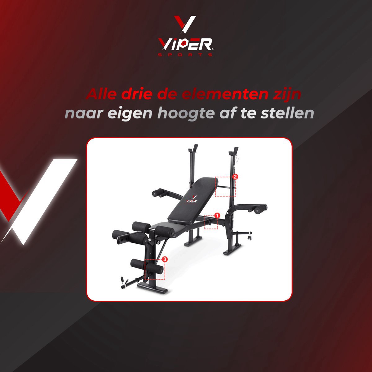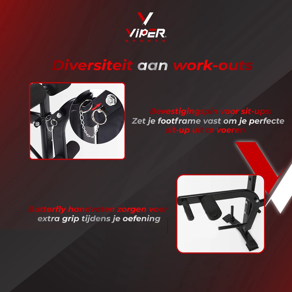 Viper Sports halterbank – Fitnessbank – Verstelbare rugleuning – Uiterst geschikt voor gewichten – Incl. Beenhouder – Zachte handgrepen – PU kussens – Triangel structuur – Inklapbaar - Zwart - 182x116x112cm