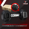 De Iron Black dumbbells van Viper Sports zijn de ultieme keuze voor sportscholen en serieuze thuisgyms. Ontworpen voor intensieve workouts, bieden deze dumbbells ongeëvenaarde veelzijdigheid. Dankzij de rubberen omhulling kun je ze zonder zorgen laten vallen, gooien of smijten, waardoor ze ideaal zijn voor snelle en intense oefeningen zoals die bij Crossfit. Bovendien zijn ze gebouwd om lang mee te gaan. De fijne grip van het ijzeren handvat zorgt voor comfort tijdens elke herhaling, terwijl de zeshoekige vorm voorkomt dat de dumbbells zomaar wegrollen.