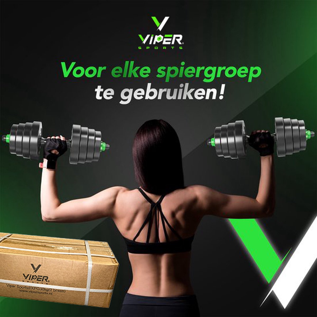 De Viper Sports dumbbells zijn nauwkeurig samengesteld voor optimale gebruiksvriendelijkheid. Het gewicht van de dumbbells of de halterstang is gemakkelijk en snel aan te passen. De onderdelen passen naadloos in elkaar en kunnen veilig worden verzekerd met behulp van het bijgeleverde, draaibare gewicht klemmen.