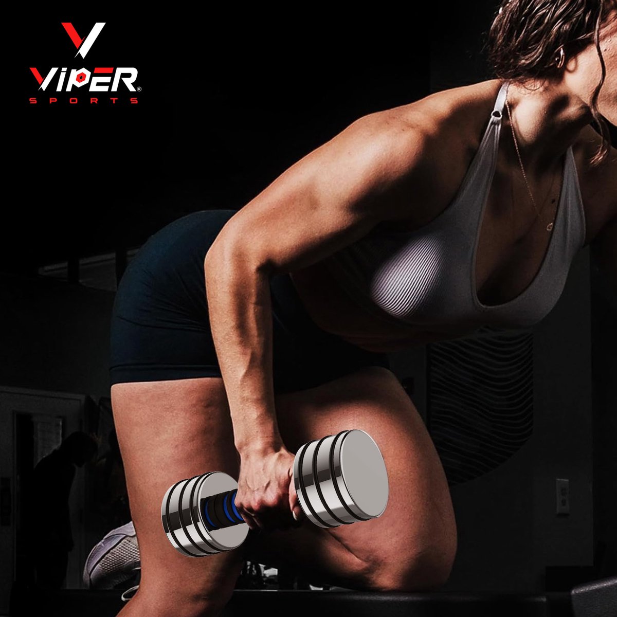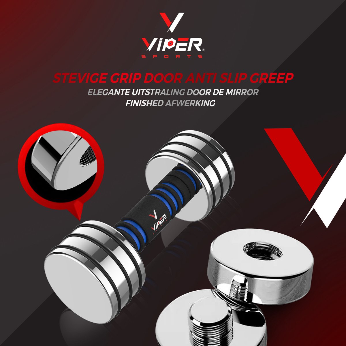 De Viper Sports Verstelbare Gewichten zijn een essentiële toevoeging aan je home gym. Met een stevige grip, hoogwaardig roestvrij staal met een elegante mirror finish bieden ze niet alleen effectieve training, maar ook een luxe uitstraling. Pas eenvoudig het gewicht aan en geniet van een veilige en stabiele workout, zonder krassen op je vloer.