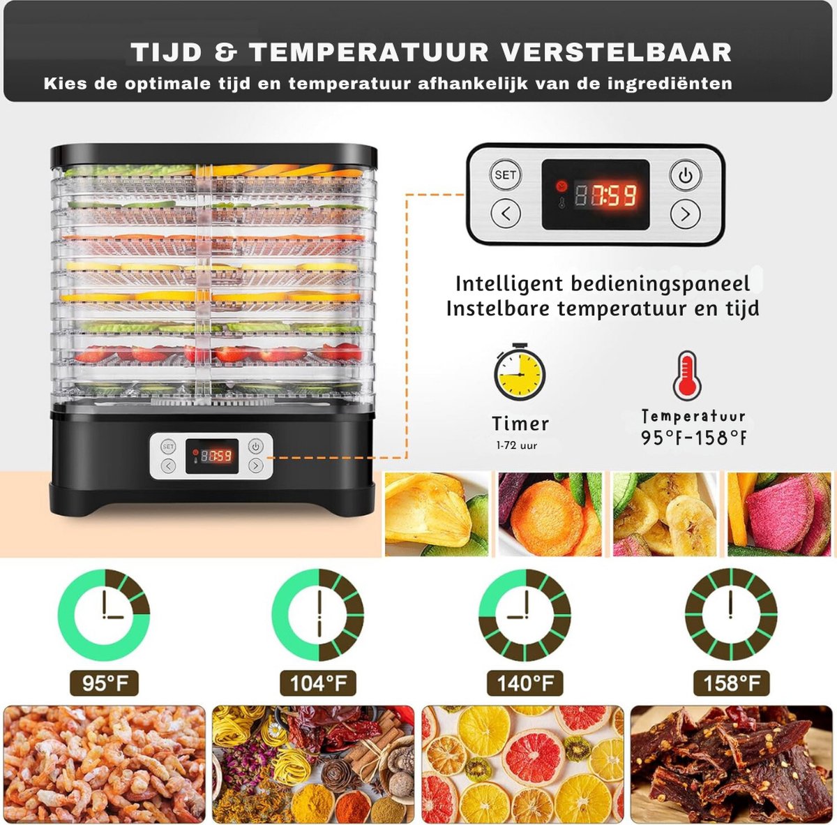 • Instelbare temperatuurregeling: De nauwkeurige temperatuurregeling zorgt ervoor dat elk type voedsel op de juiste temperatuur wordt gedroogd. Van delicate kruiden tot stevige vleessoorten, de voedseldroger past zich moeiteloos aan je wensen aan.