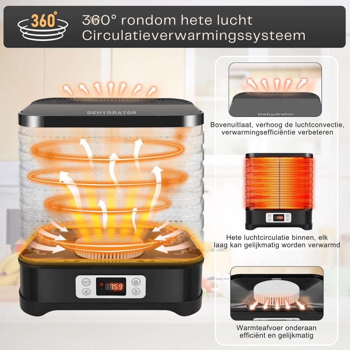 • Krachtige ventilator: De ingebouwde ventilator zorgt voor een gelijkmatige luchtcirculatie, wat resulteert in een consistent droogproces. Geen halve resultaten, maar perfect gedroogd voedsel, elke keer weer.
