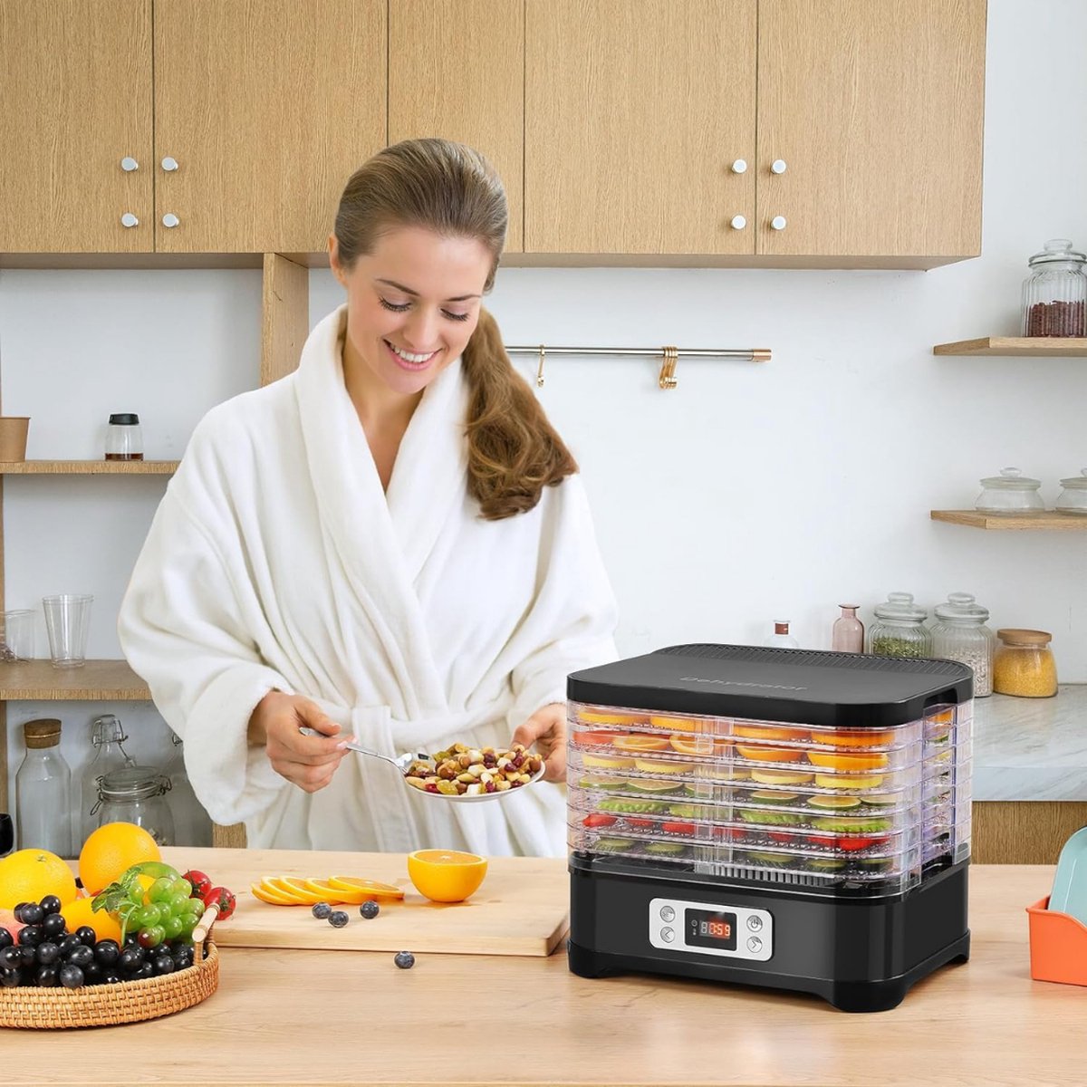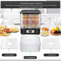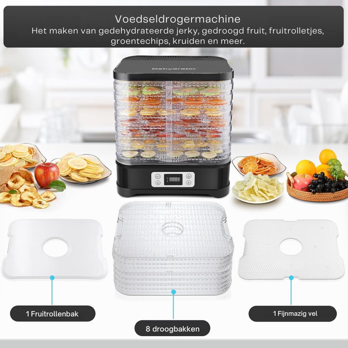 • Meerdere drooglagen: Dankzij de stapelbare drooglagen kun je verschillende soorten voedsel tegelijk drogen zonder dat de smaken zich vermengen. Droog fruit, groenten, vlees of kruiden tegelijkertijd en bespaar tijd.