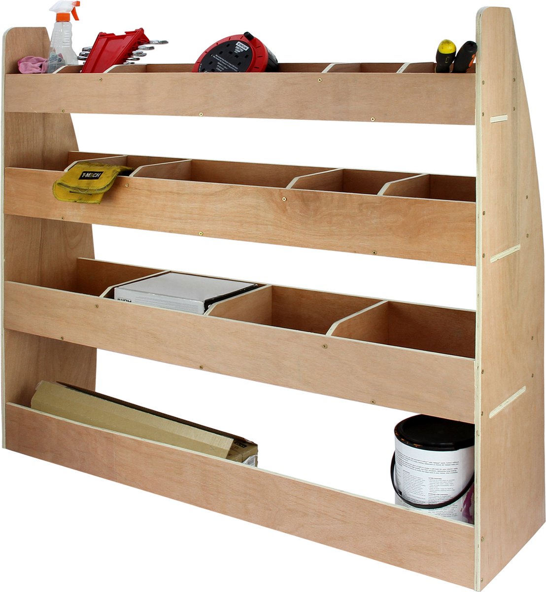 • Gemaakt van 12 mm dik multiplex, dit bestelwagenrek moet in uw bestelwagen worden vastgezet om een ​​sterk en stevig planksysteem te creëren dat klaar is om hulpstukken, handgereedschap en accessoires te organiseren.