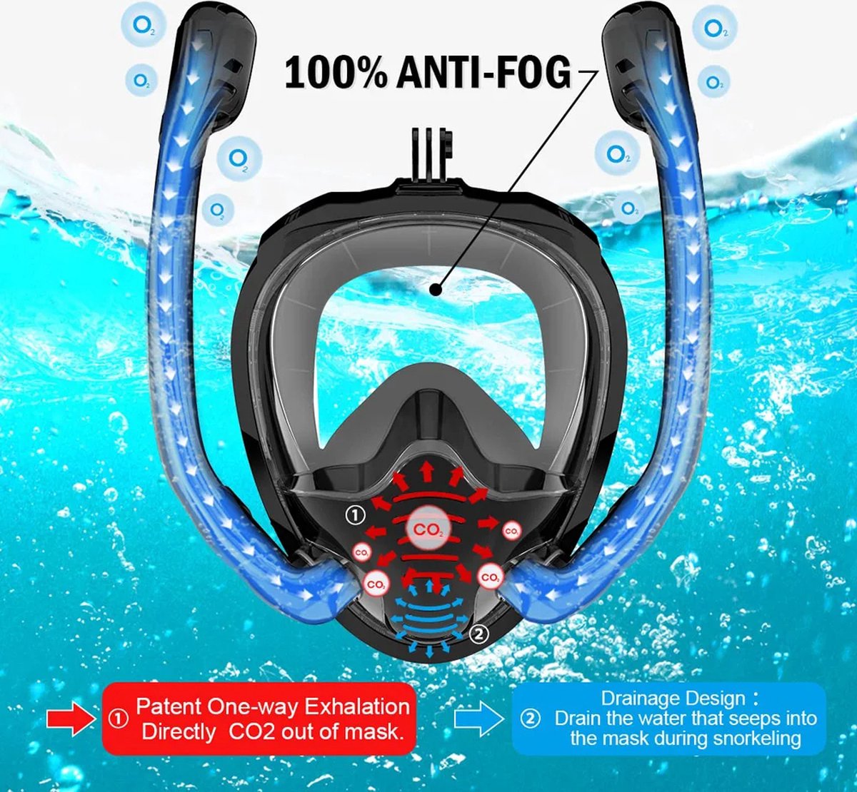 • Anti-Fog Technologie: De geavanceerde anti-fog technologie voorkomt dat het masker van binnen beslaat, waardoor je altijd een helder en duidelijk zicht hebt. Dit zorgt voor een veilige en plezierige ervaring tijdens het snorkelen of duiken.