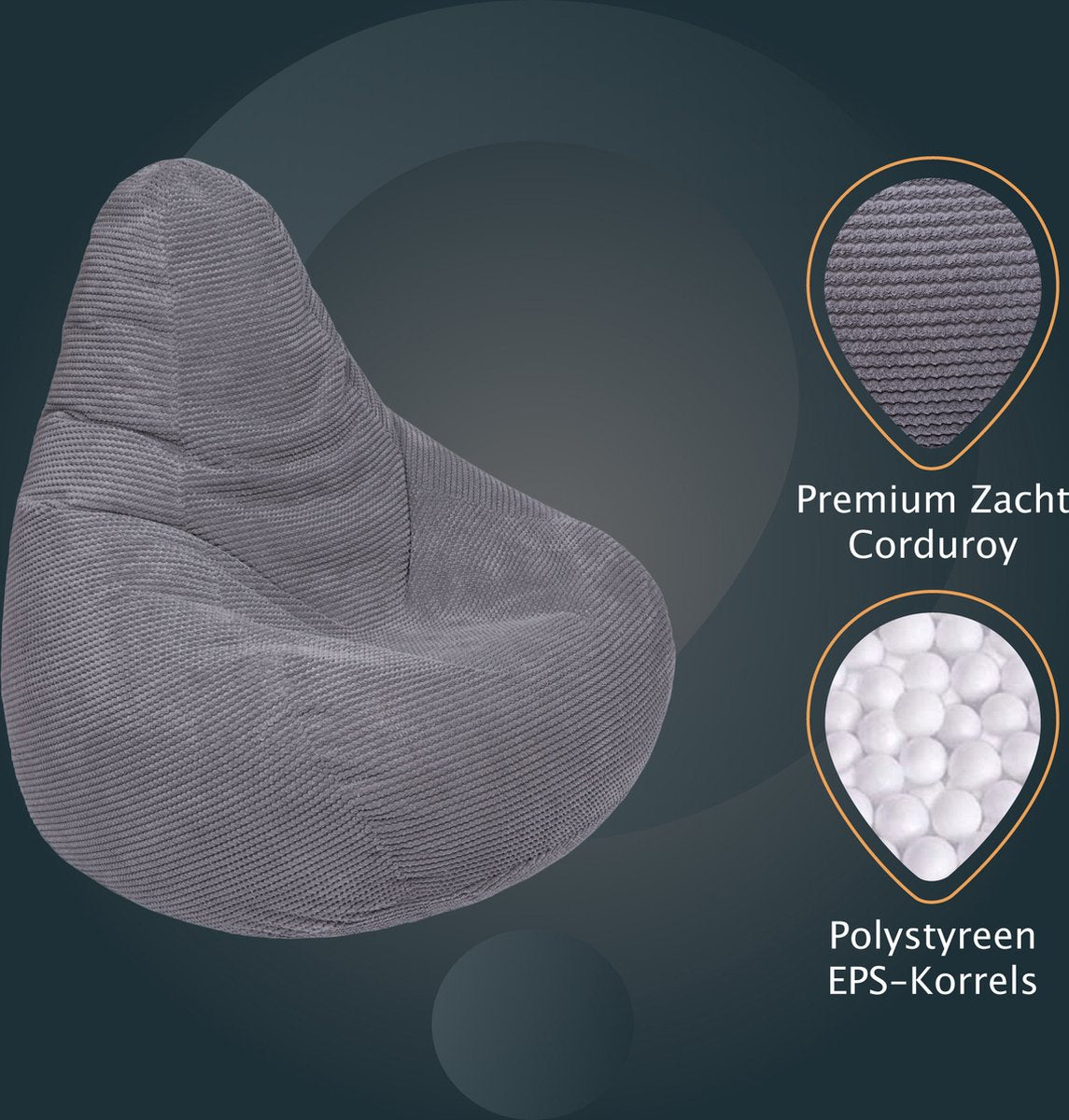 De zitzakken zijn gemaakt van geweven Corduroy-stof voor een comfortabel gevoel. Het materiaal is zacht en dubbel gestikt om scheuren te voorkomen.