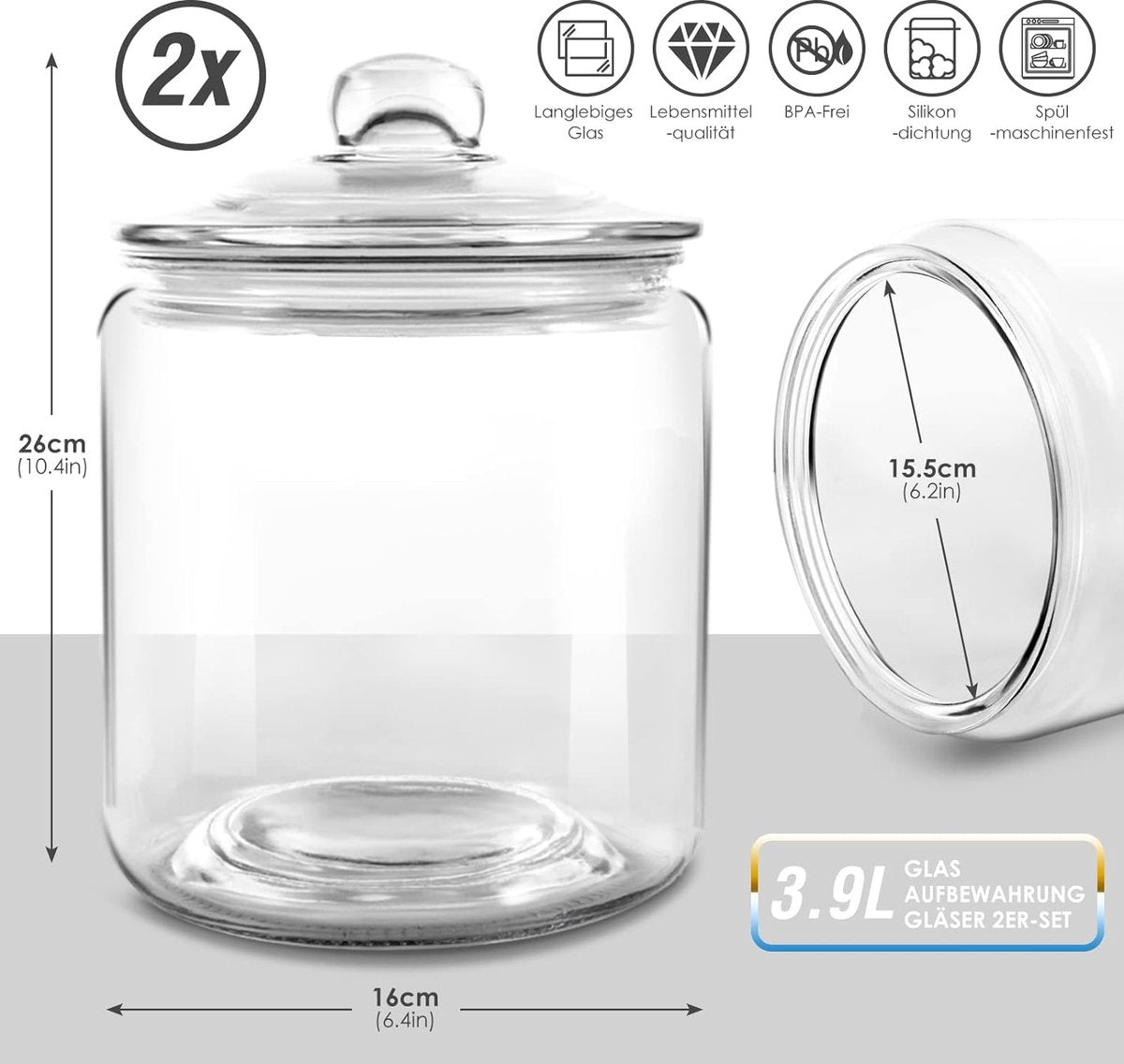- Grote inhoud 3,9 l: de set bevat 2 glazen potten met grote inhoud, elk met een inhoud van 3,9 liter, afmetingen: 16 x 26 cm. Als voorraadpotten met deksel, bevat grote hoeveelheden koekjes, snoep, pasta, noten, jam, meel, fruit, groenten en andere levensmiddelen.