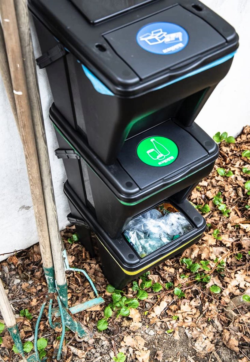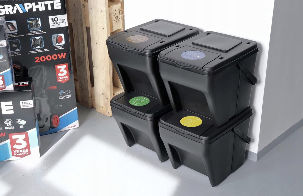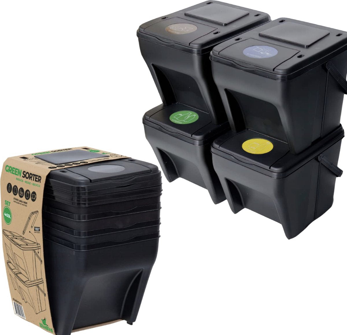 • Set van 4 afvalsorteermanden van duurzame, weerbestendige kunststof. 4 x Green Sorter containers met een inhoud van elk 25 l, in totaal 100 l.