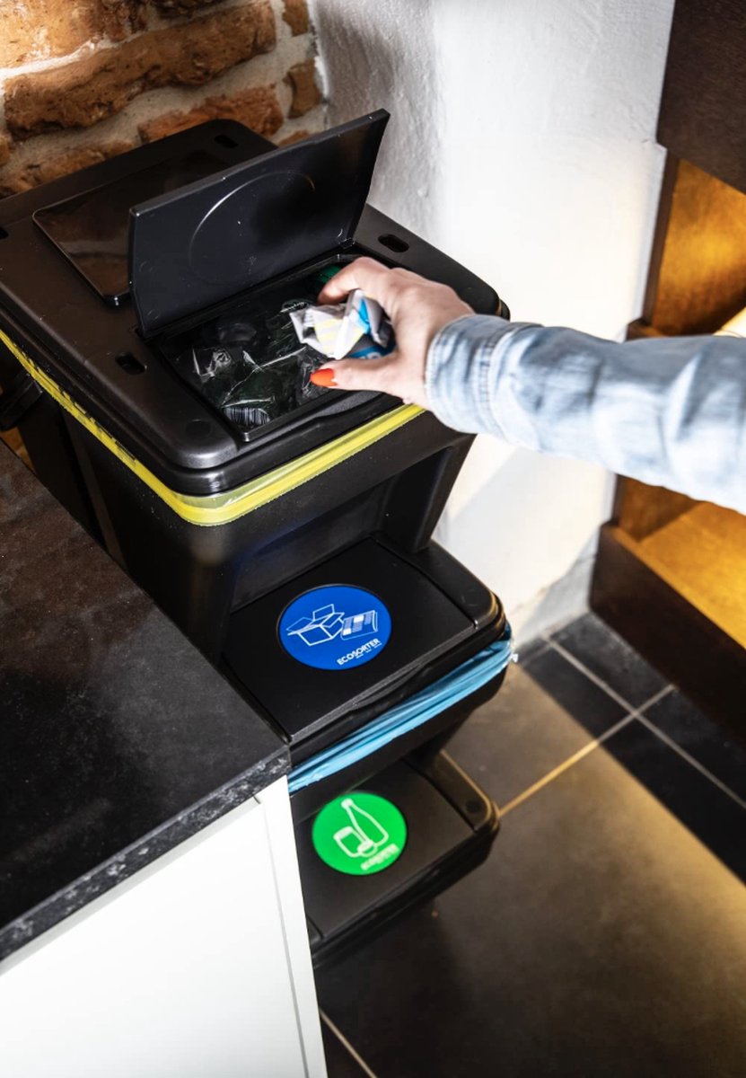 • Deksel met kleppen beschermen het opgeslagen afval en bieden tegelijkertijd vrije toegang tot het binnenruimte; meegeleverde stickers vergemakkelijken de identificatie van de inhoud.