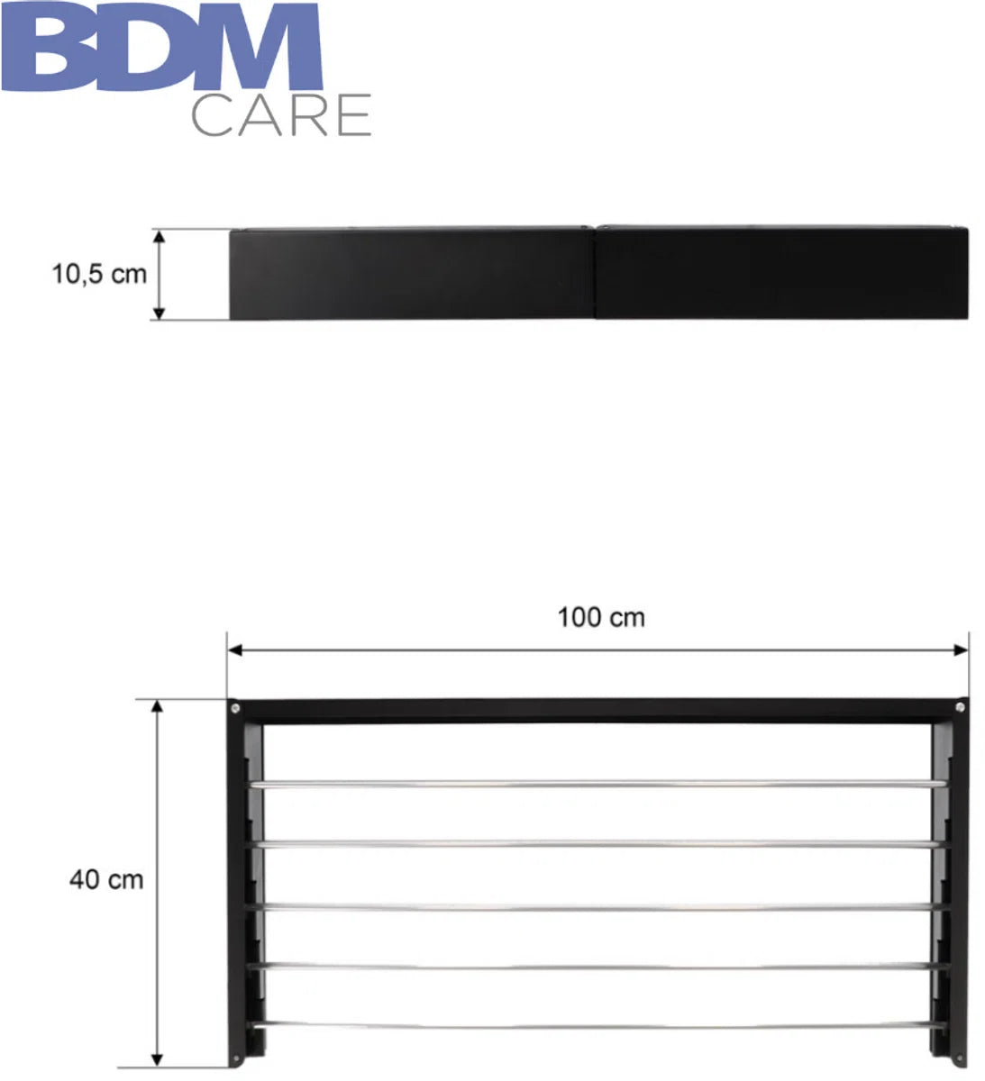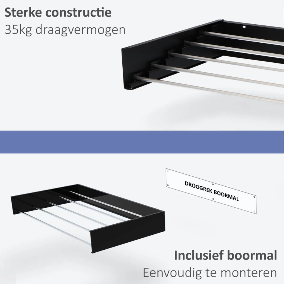 Wanddroogrek XL Zwart 100 cm - Inclusief Boormal - Droogrek Inklapbaar - Wasrek Hangend - Uitklapbaar - Ophangbaar aan de muur- 5 meter Drooglengte