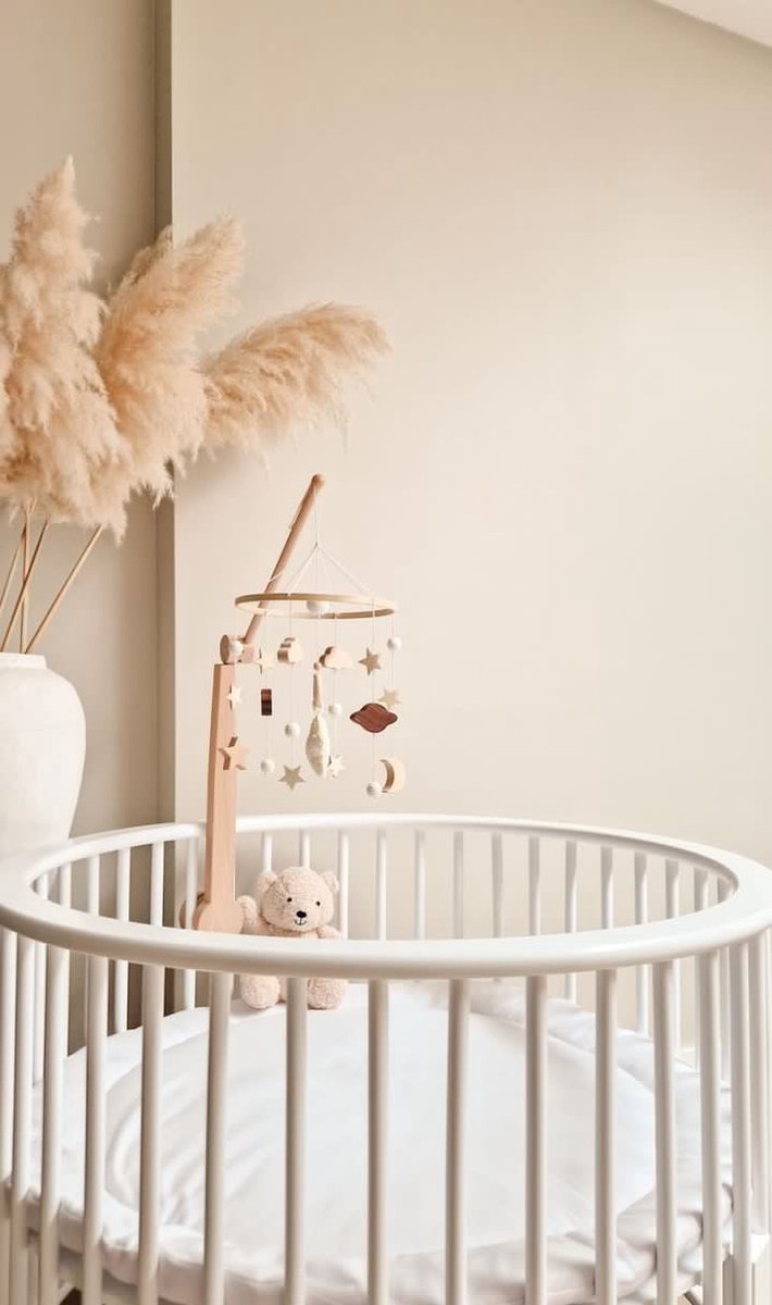 De babymobiel en houder bestaan uit rustgevende, natuurlijke tinten en zijn perfect met het interieur te combineren. Deze unieke eyecatcher transformeert de babykamer. Leuk voor de kleintjes én papa & mama.