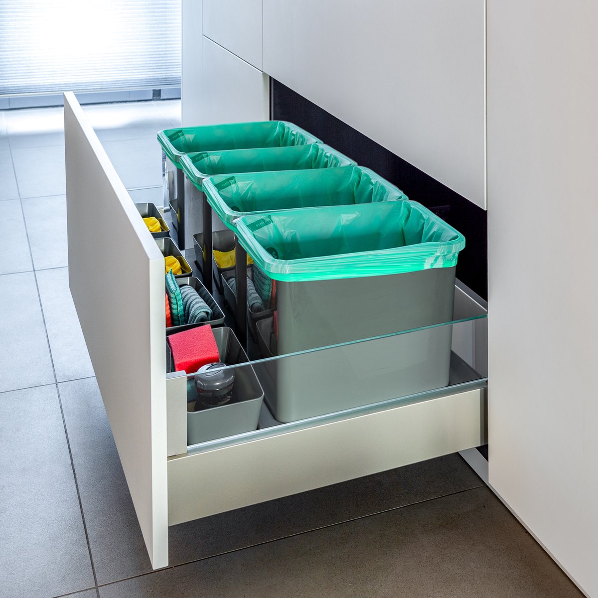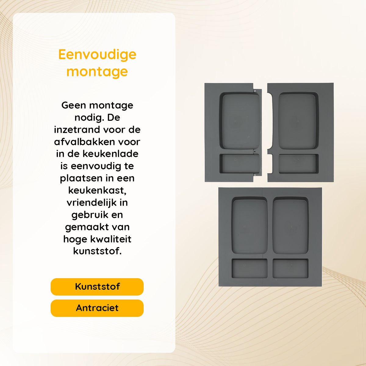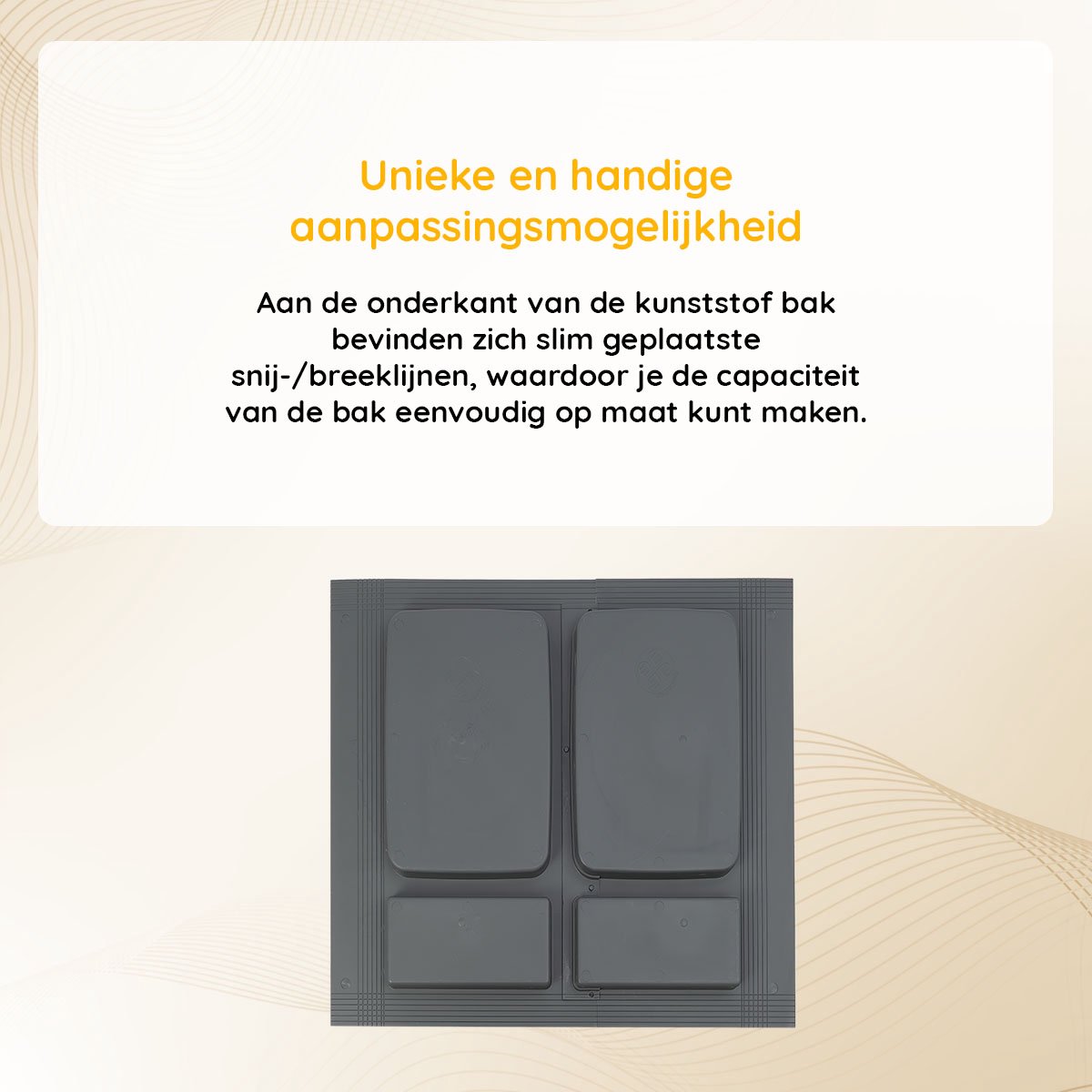 De afvalbak is ontworpen met een unieke aanpassingsmogelijkheid die perfect aansluit bij de behoefte aan flexibiliteit in jouw keuken. Aan de onderkant van de kunststof bak bevinden zich slim geplaatste snij-/breeklijnen, waardoor je de capaciteit van de bak eenvoudig op maat kunt maken. Dit maakt het een uiterst functionele toevoeging aan jouw keuken, maar ook een die rekening houdt met specifieke behoeften en voorkeuren. Met deze afvalbak kies je voor een afvalbeheeroplossing die groeit en zich aanpast aan jouw leven, zonder in te leveren op design of gebruiksgemak.