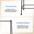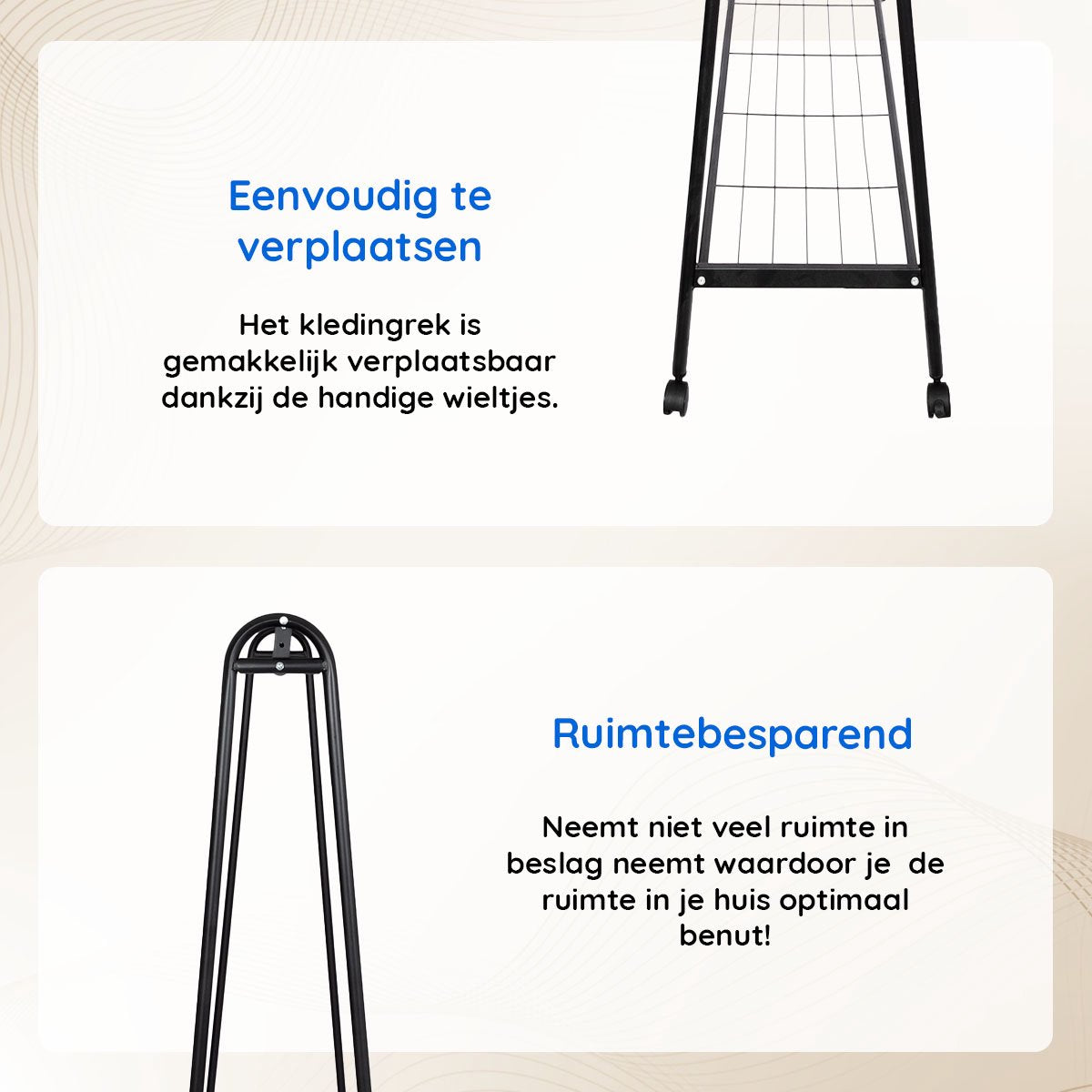 Het kledingrek optimaliseert de beschikbare ruimte met een compact ontwerp, ideaal voor kleine kamers en appartementen, waardoor efficiënt gebruik wordt gemaakt van de beschikbare ruimte.