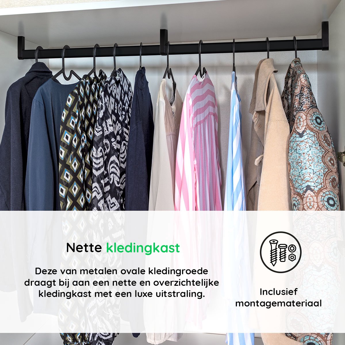 Deze van metalen ovale kledingroede, inclusief kastroededragers en middenhouder, draagt bij aan een nette en overzichtelijke kledingkast met een luxe uitstraling. De roede is eenvoudig te monteren in kledingkasten. Door de luxe matte zwarte afwerking kan de roede ook gebruikt worden in een inloopkast en fungeert deze goed als garderobestang voor jassen. De garderobebuis is extra stevig en zwaar, zodat u veel kleding op de kleerstang kunt ophangen. Zowel de kledingdrager als de bijpassende steuntjes hebben een mooie matt zwarte afwerking. De 2 meegeleverde roedehouders en de middenhouder zijn makkelijk met de bijgeleverde M6 bouten door de bovenliggende plank (maximaal 25 mm dik) te bevestigen en zorgen ervoor dat de kleerstang snel en makkelijk te monteren is.