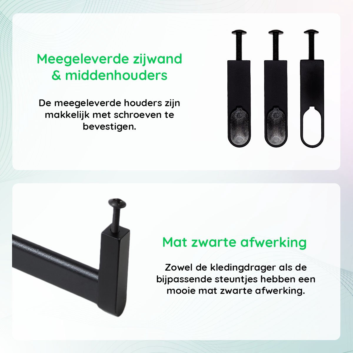 Onze extra sterke metalen kledingroede is ontworpen om zelfs de zwaarste ladingen te weerstaan, zodat u al uw kleding met vertrouwen kunt ophangen. Met twee eindstukken en een midden steunstuk is onze kledingroede meer dan alleen een plek om je kleding op te hangen - het is een solide meubelstuk dat jarenlang gebruik zal doorstaan.