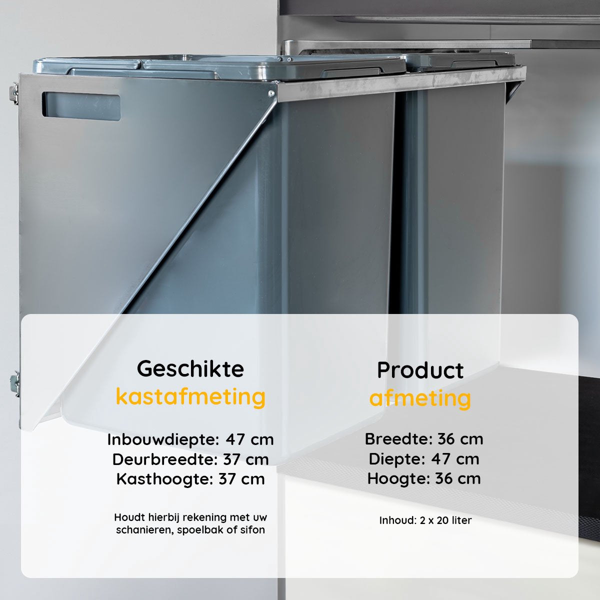 Let op! Deze afvalbak is in te bouwen in kastjes vanaf de volgende afmetingen: Deurbreedte 40 cm, inbouwdiepte 47 cm & inbouwoogte 37 cm!