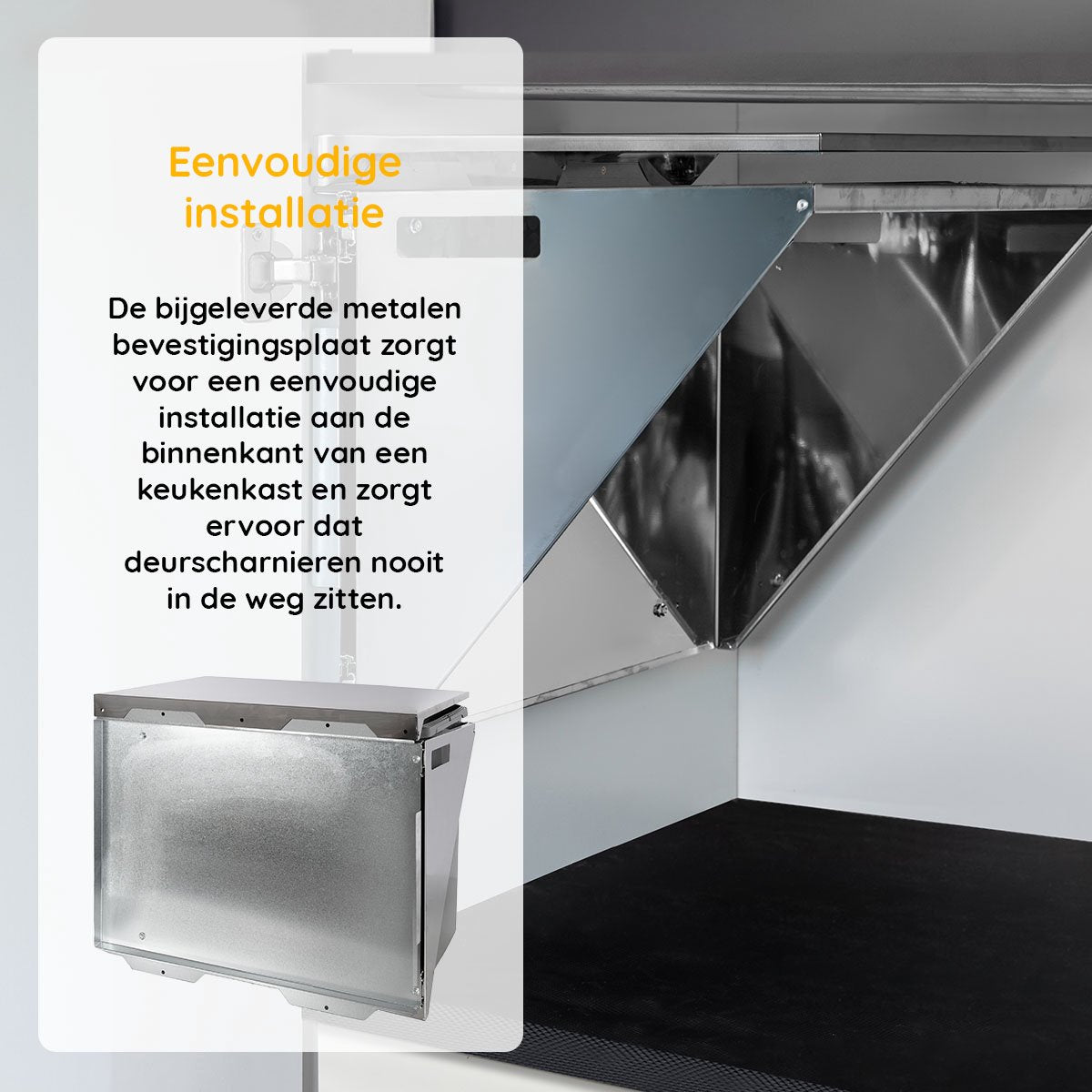 Dankzij de innovatieve bevestigingsplaat worden problemen met deurscharnieren vermeden. Deze plaat zorgt ervoor dat de afvalbak moeiteloos uittrekbaar is, zonder dat de scharnieren de beweging hinderen, wat de gebruiksvriendelijkheid ten goede komt.