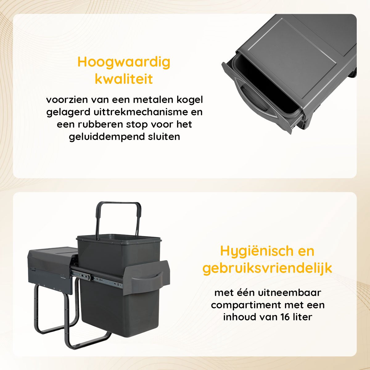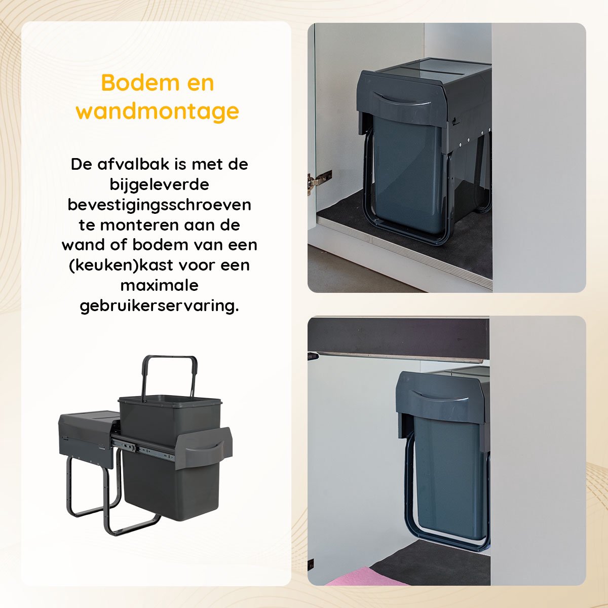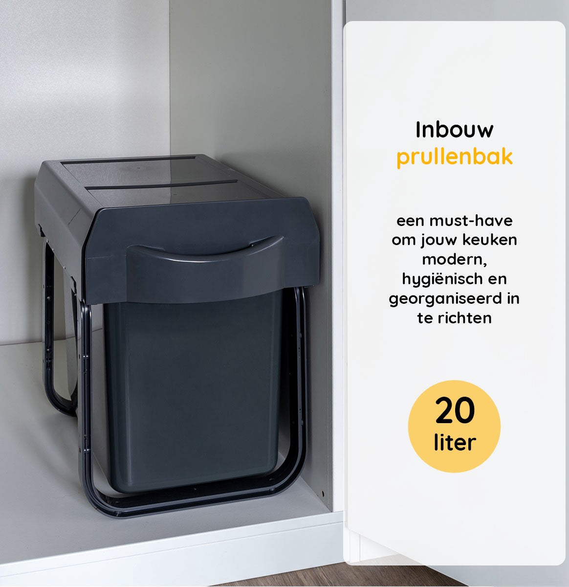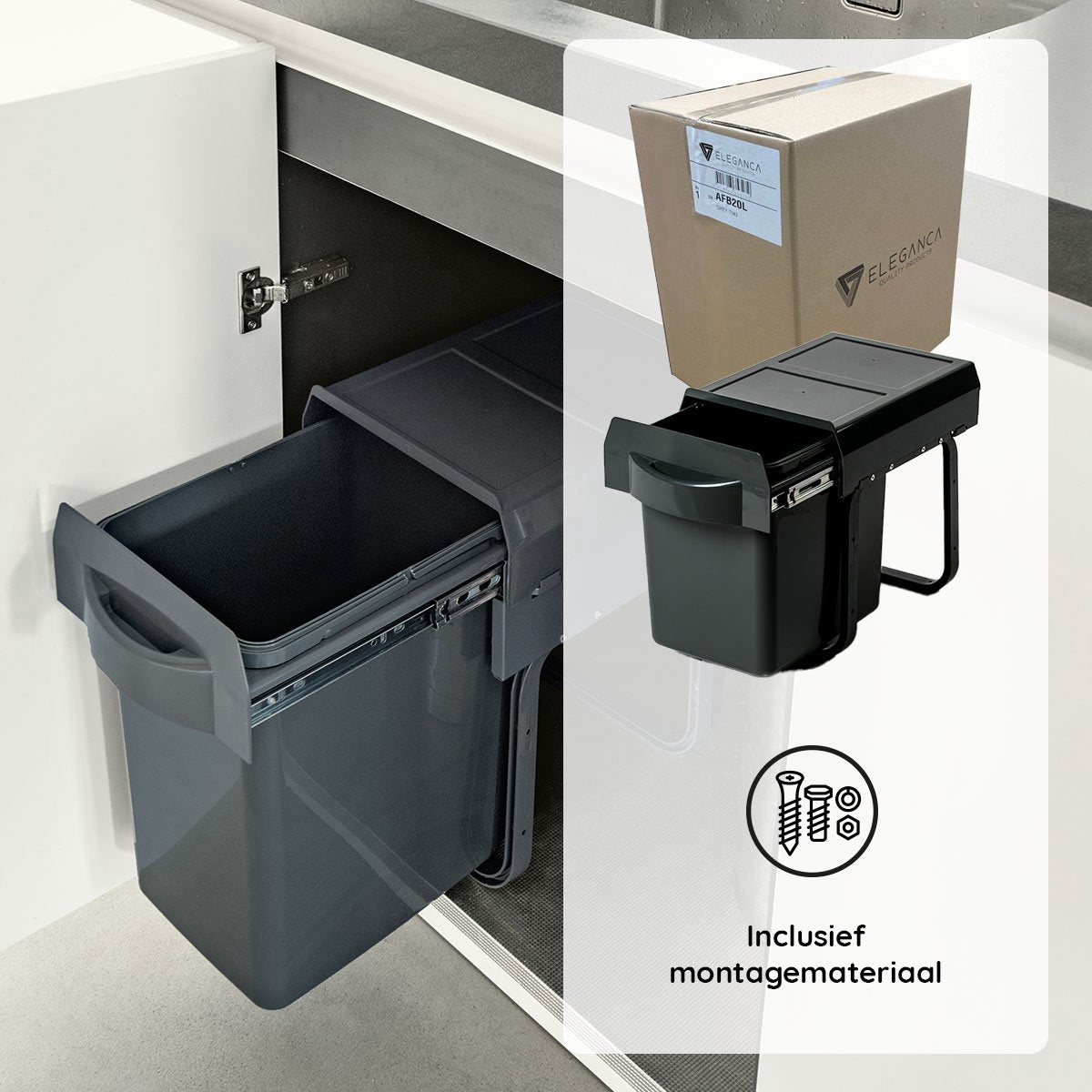 Eleganca Uittrekbare Afvalbak 20 Liter – Inbouw Afvalemmer - Inbouwvuilbak - Geschikt voor Deurbreedte vanaf 30 cm en inbouwdiepte 38 cm – Antraciet
