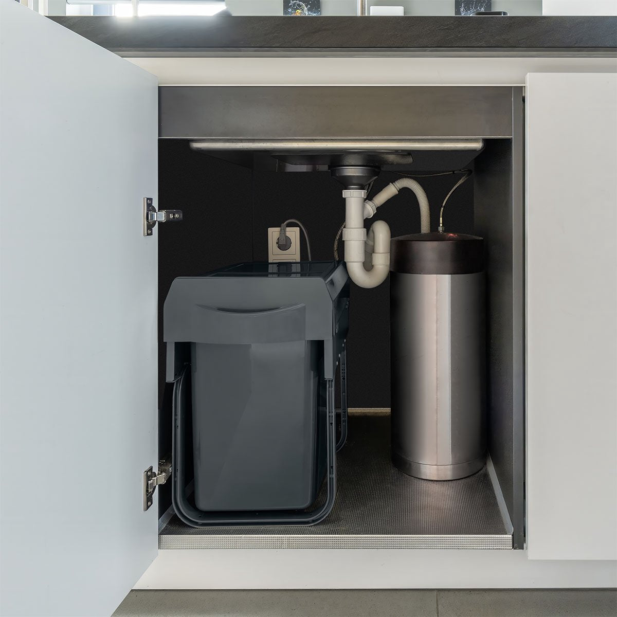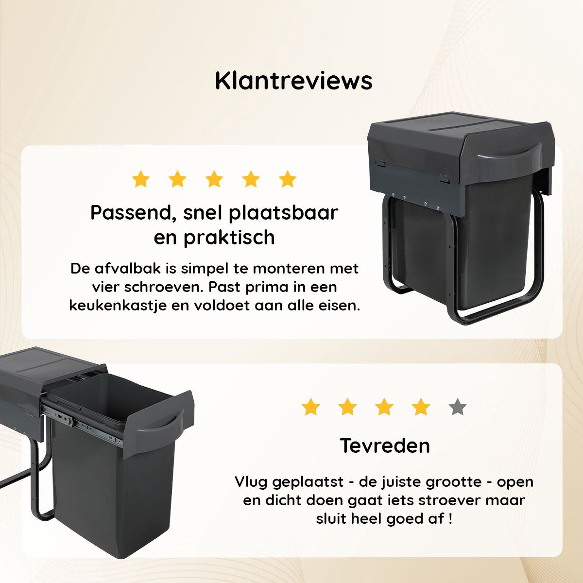 LET OP: Deze prullenbak past perfect in keukenkastjes met een minimale deurbreedte van 27 cm, minimale inbouwdiepte van 38 cm en een minimale kasthoogte van 42 cm.