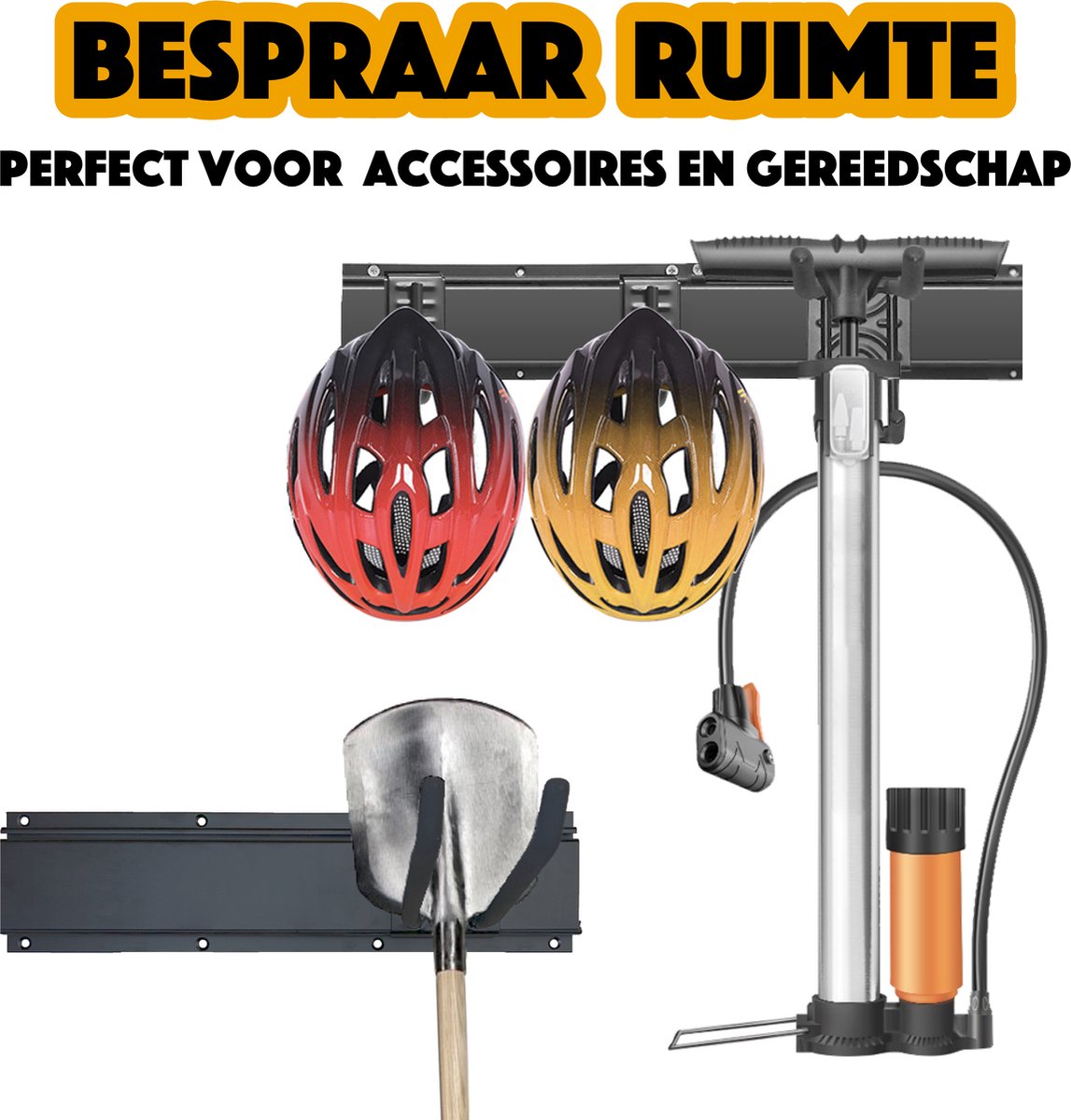 Ons fiets ophangsysteem heeft naast ruimte voor 3 fietsen ook nog ruimte voor 2 fietsaccessoires en 2 garagetools. Hierdoor hoef je nooit meer te zoeken naar je accesoires, alles is op één plek opgeborgen. Dit betekent dat je altijd snel toegang hebt tot de spullen die je nodig hebt. Buiten een georganiseerde garage kan dit veel kostbare tijd besparen in de ochtend of als je haast hebt.