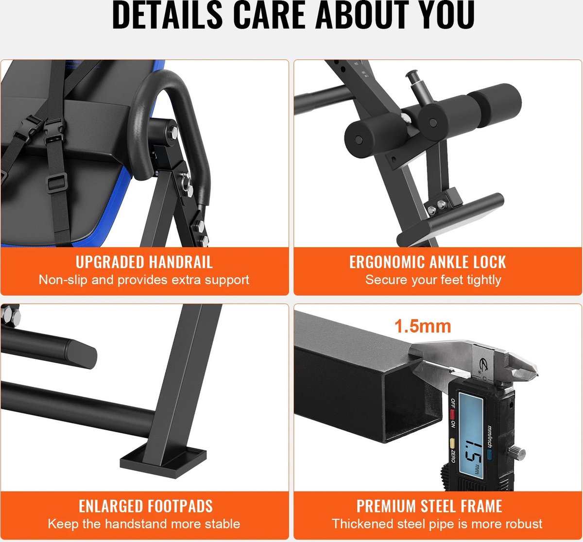 Doordachte details: de verbeterde antislip-leuning biedt extra ondersteuning tijdens gebruik, terwijl het ergonomische enkelslot uw voeten stevig vastzet. Vergrote voetzolen houden u stabiel tijdens handstanden en het hoogwaardige stalen frame, gemaakt van verdikte stalen