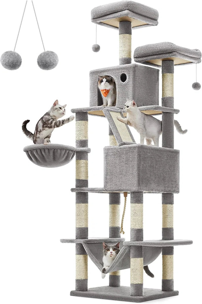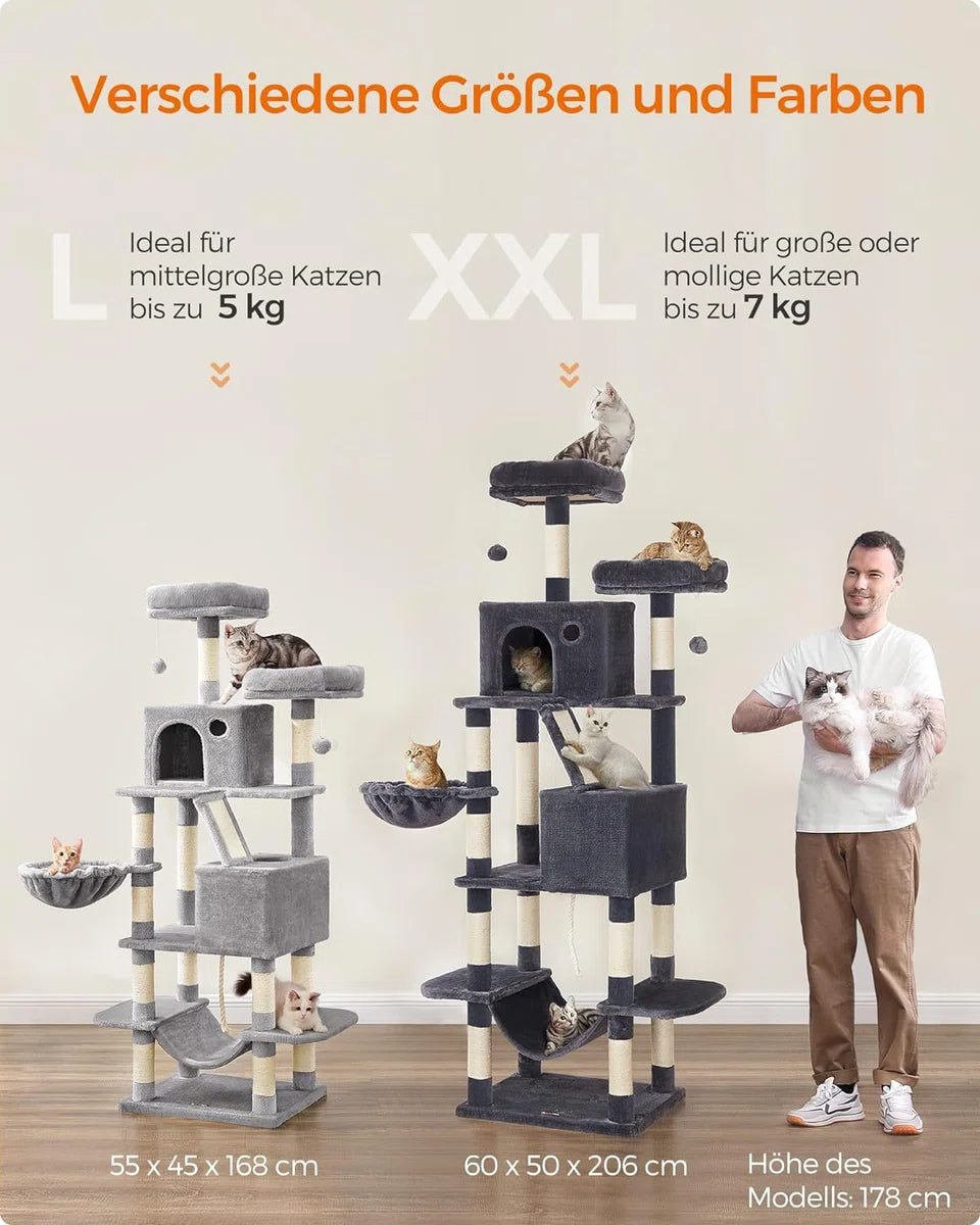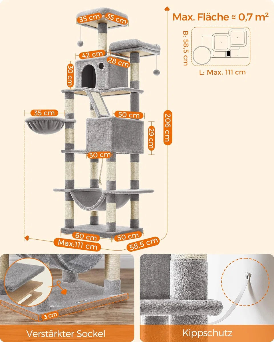 - [Stevig, veilig en beschermd] Dankzij kwaliteitsspaanplaat, een grote basis met verstevigde bodemrails en een anti-kantelvoorziening is deze stevige krabpaal geschikt voor maximaal 6 grote katten (elk 7 kg).
