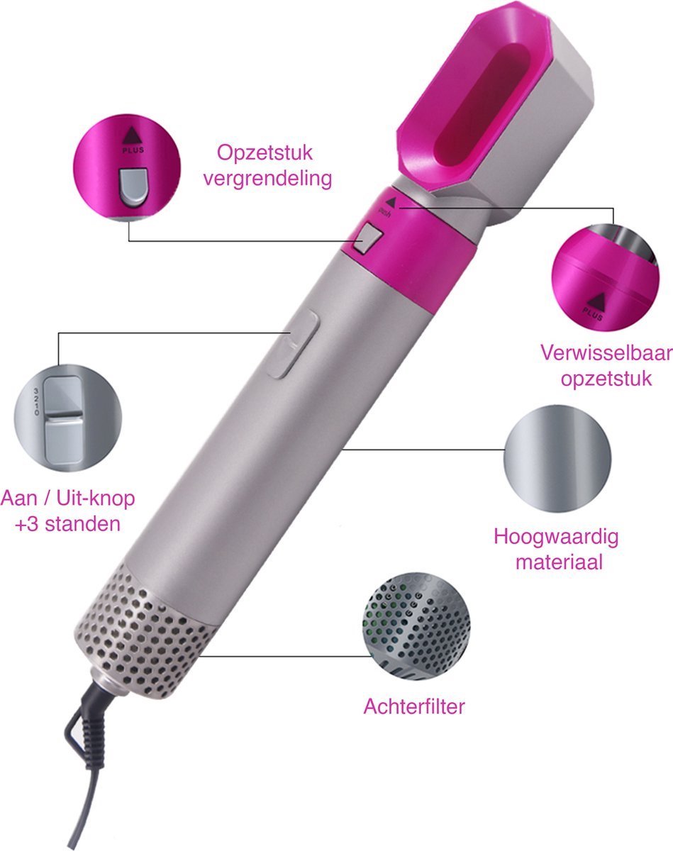 De set bevat meerdere koppen voor diverse haartypes en resultaten, allemaal in één handige set. Dit betekent dat u de perfecte tool hebt voor elke haarstijl die u wilt creëren, of u nu op zoek bent naar een gladde, steile look of prachtige krullen.