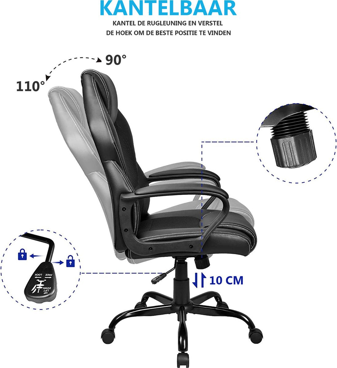 ✔ Rugleuning met kantelmechanisme (90-110 graden) Vermindert de druk op uw wervelkolom en verlicht vermoeidheid.