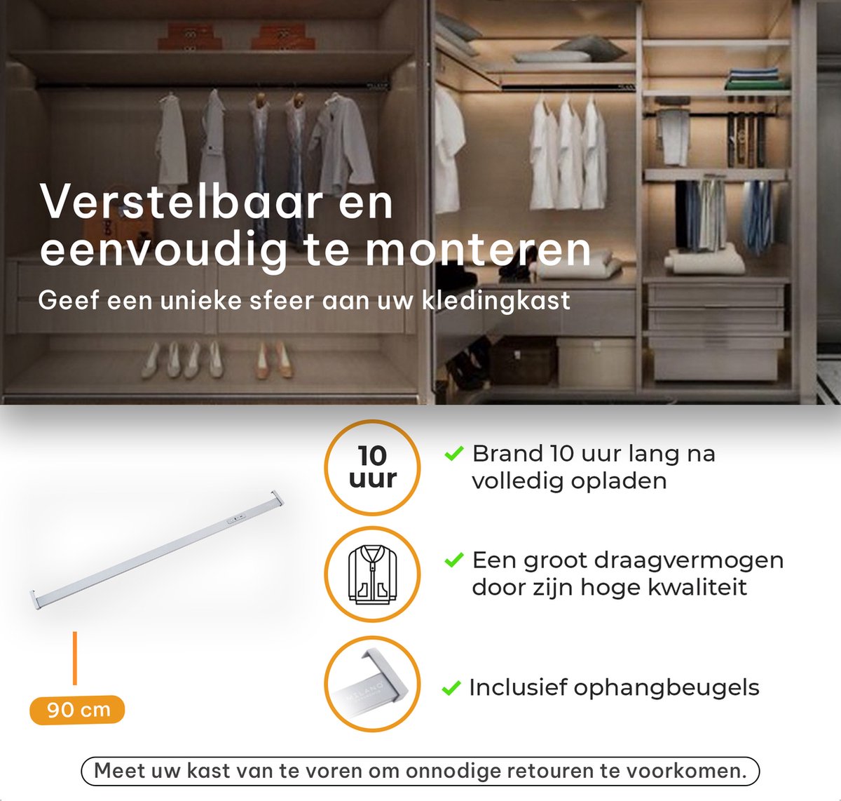 - Verlichte kledingroede die eenvoudig kan worden gemonteerd met de bijgeleverde ophangbeugels.