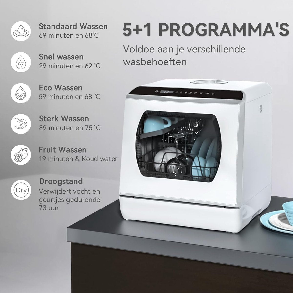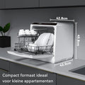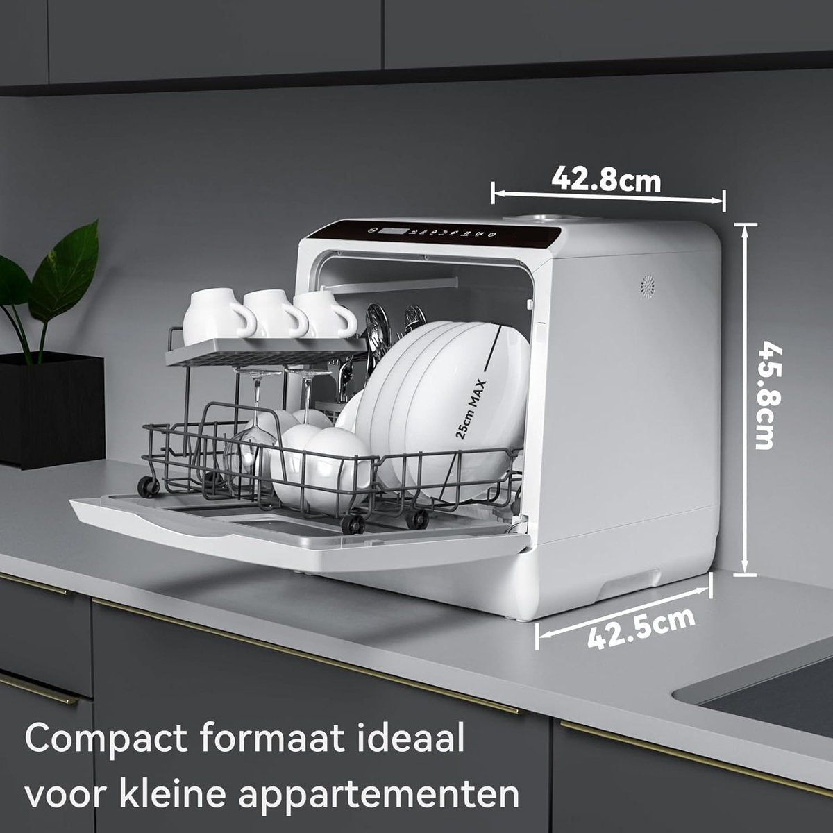 Compact en Ruimtebesparend: Deze mini-vaatwasser is ontworpen voor degenen die op zoek zijn naar maximale efficiëntie in een compact formaat. Met afmetingen van slechts 43 cm breed past hij perfect in elke keuken, zelfs waar ruimte schaars is.