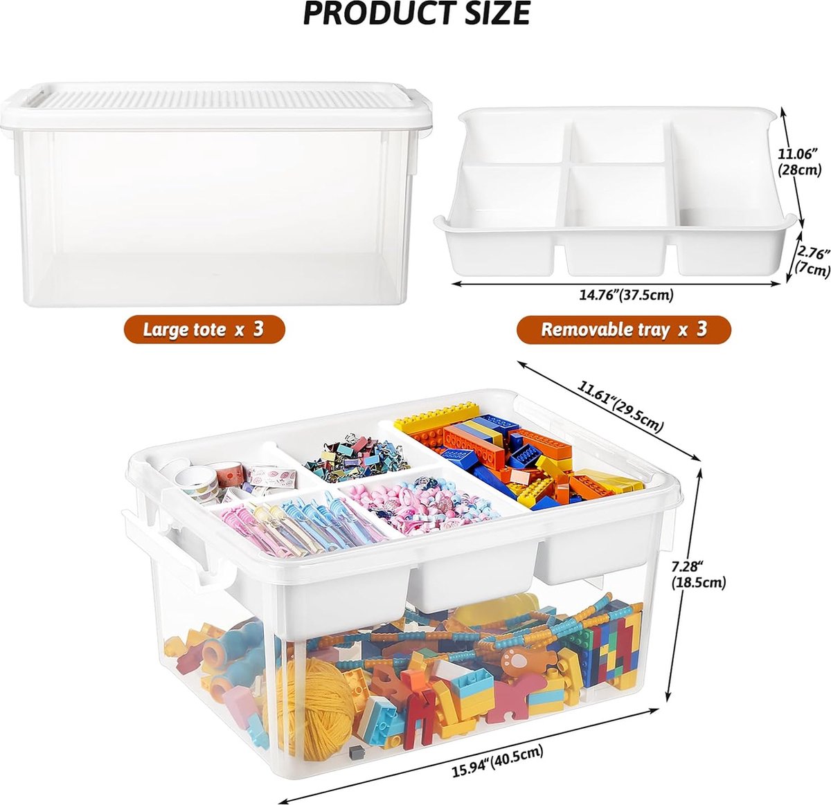 【3 opbergdozen】 - Het pakket bevat drie speelgoeddozen met verwijderbare trays. De afmeting van de opbergdoos is: 40,5 x 29,5 x 18,5 cm; Het formaat van het dienblad is: 37,5 x 28 x 7 cm. Het verschil met andere speelgoedopbergboxen is dat de deksel van onze speelgoedopbergbox is gemaakt van spaanplaat met bouwstenen bevat geen schadelijke ingrediënten. 【Ideaal ontwerp】 - Onze speelgoedorganizer wordt geleverd met een verwijderbare scheidingswand met vijf compartimenten voor kleine voorwerpen zoals pennen, clips, pads of tape. Het kan uw spullen effectief classificeren en organiseren. De grote doos aan de onderkant is geschikt voor alles wat u nodig heeft wilt organiseren. Dankzij het transparante kleurontwerp kun je het speelgoed erin gemakkelijk onderscheiden 【Stapelbare containers】 - In tegenstelling tot andere opslagcontainers zijn onze speelgoedorganizers gemaakt van verdikt plastic. Het is en steviger. En ze kunnen op elkaar worden gestapeld om ruimte te besparen en uw kamer netjes te houden. De doos is heel gemakkelijk schoon te maken en als hij vuil is, hoeft u hem alleen maar voorzichtig af te vegen met een vochtige papieren handdoek en hij zal heel schoon zijn. 【Veelzijdig gebruik】- Perfect voor opslag in de slaapkamer of speelkamer. Perfect voor het opbergen van stenen, knuffels, barbiepoppen, tollen of ander los speelgoed dat gemakkelijk kwijt kan raken. Je kunt ze ook gebruiken voor het opbergen van alledaagse voorwerpen zoals boeken, kleding, handdoeken, kantoorbenodigdheden, gereedschap enz. Volledige opbergruimte om verlies te voorkomen en uw kamer perfect te decoreren