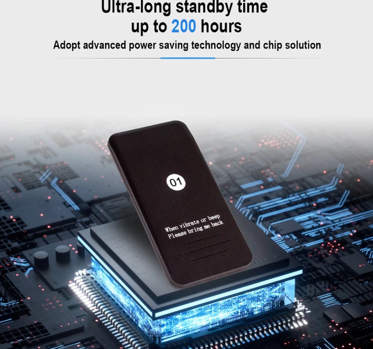 De pager heeft een standby-tijd van ongeveer 200 uur dankzij de ingebouwde 3.7V 230mAh oplaadbare lithiumbatterij. Dit zorgt voor langdurig gebruik zonder frequente oplaadbeurten.