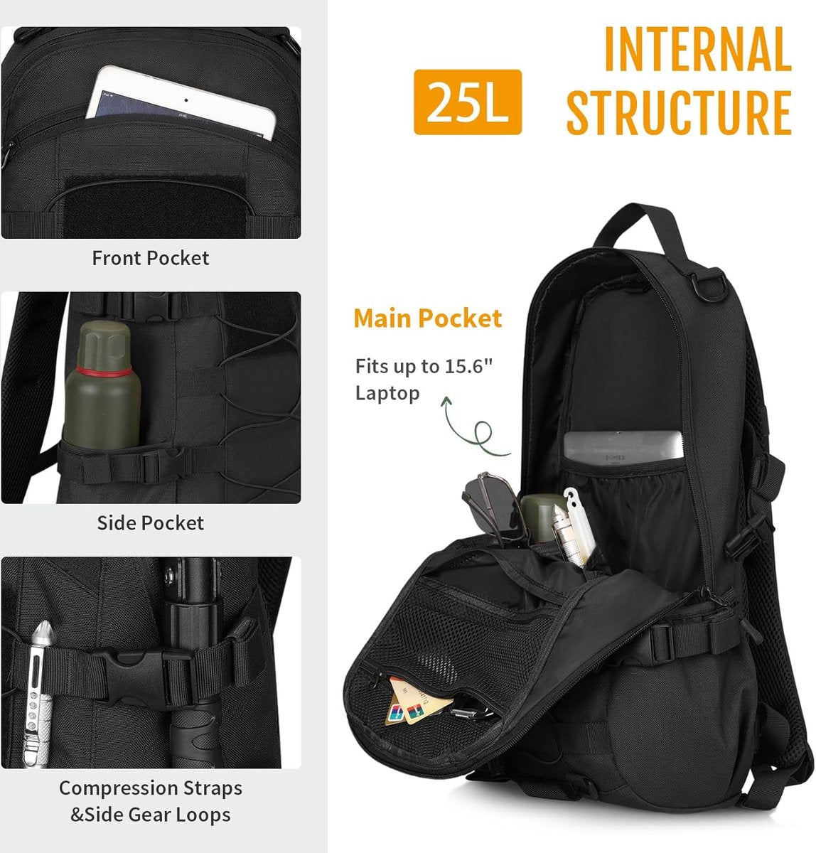 Tactische rugzak, 25 liter, 1000D nylon, tactische dagrugzak, leger, wandelrugzak, Molle vechtrugzak, waterafstotend, voor heren en dames, universiteit, reizen, sport, outdoor, klimmen,