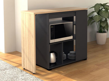 Design en functionaliteit komen samen in deze draaibare barkast met een veelzijdig draaibaar blad, ideaal voor het ontvangen van extra gasten wanneer u dat wilt. Met zijn zes opbergvakken kunt u gemakkelijk uw magnetron inbouwen en uw servies opbergen.