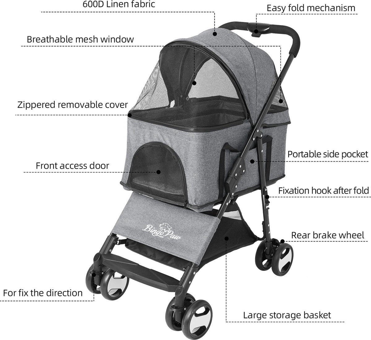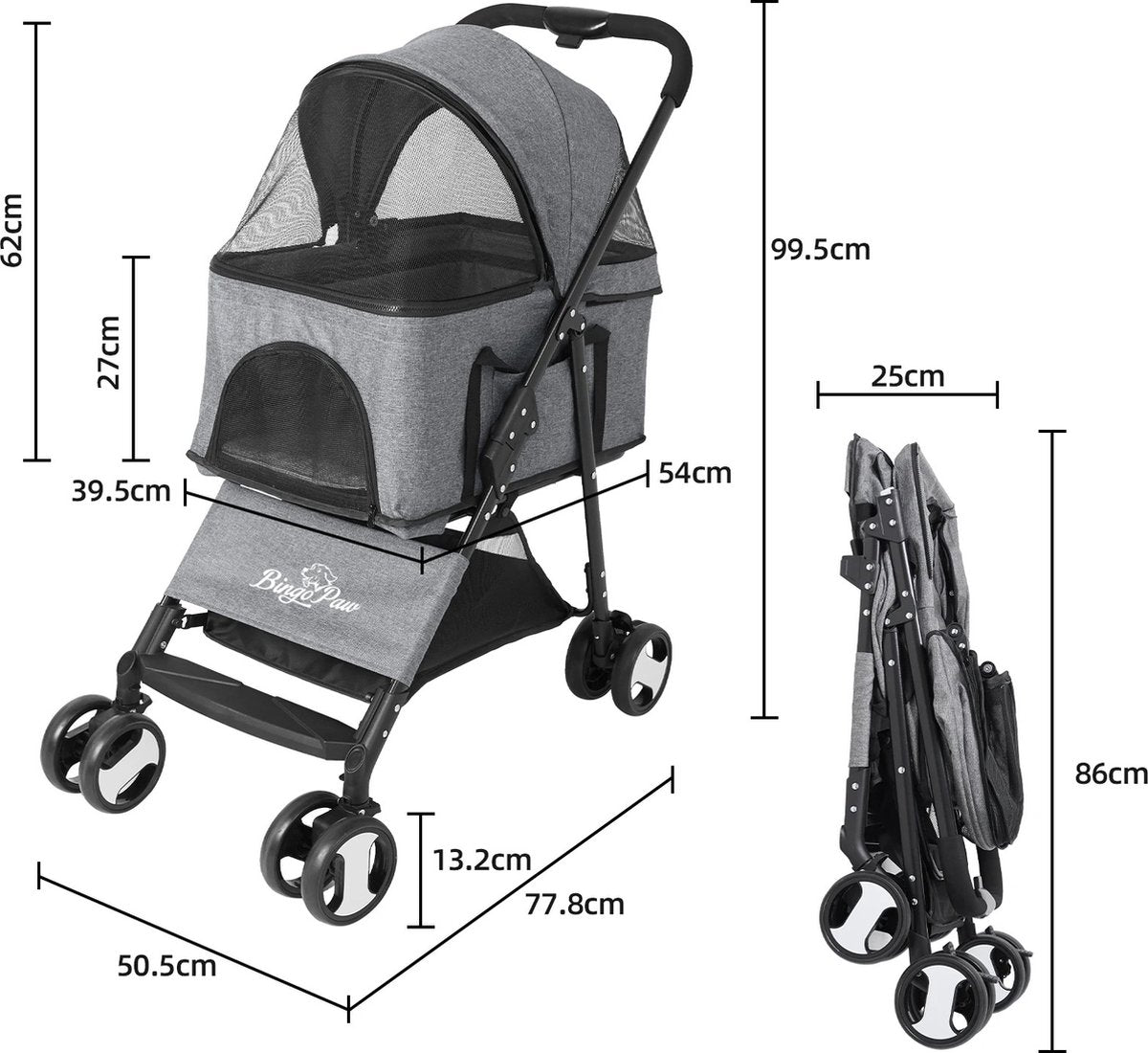 • Vier Wielen voor Stabiliteit: De vier wielen zorgen voor stabiliteit en soepele navigatie, zelfs op oneffen terrein, waardoor je hond comfortabel kan reizen.