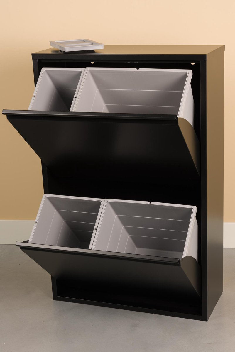 Het strakke design maakt dat deze vuilnisbak met 4 binnenemmers meer op een kastje lijkt dan op een afvalbak. Kies je favoriet uit de beschikbare kleuren zwart, metallic grijs of wit voor een mooie blikvanger in je keuken.